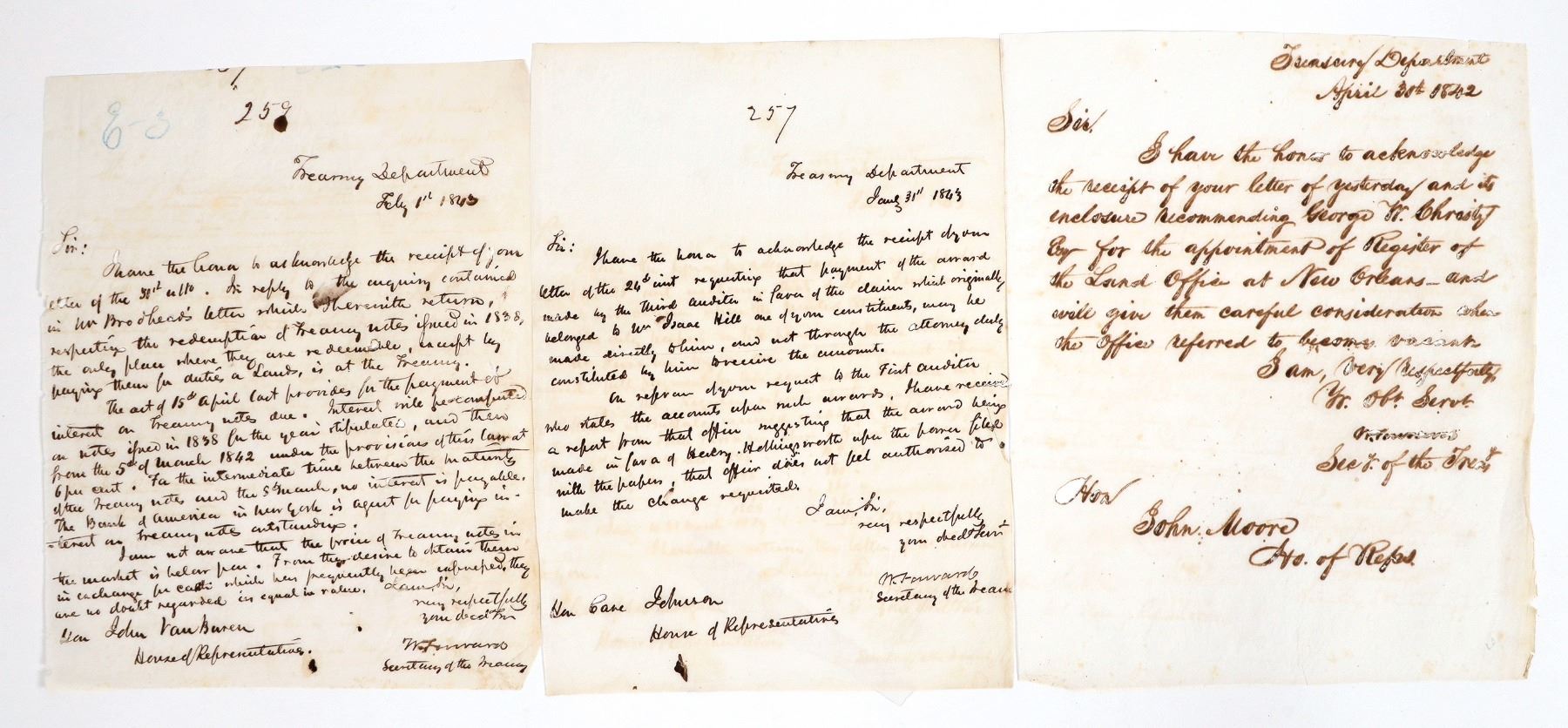 Three Secretary of Treasury Walter Forward signed letters including one to a member of the house of Representatives. 1842 and 1843. "He was appointed 15th U.S. Secretary of the Treasury by President John Tyler. Bureau of Engraving and Printing portrait of Forward as Secretary of the Treasury. During his tenure as Treasury Secretary, the Independent Treasury System of 1840 was abolished, and the government's funds were deposited once more with commercial banks. Soon after Forward took office, he was asked by Millard Fillmore, then chairman of the U.S. House Ways and Means Committee, to devise a plan to increase the tariff, in response to the serious decrease in revenue caused by the Panic of 1837. He was also asked to develop plans for a "Board of Exchequer" to receive and disburse customs revenue, since the Independent Treasury System was no longer in effect. In August 1842 a strongly protective tariff was passed. Since constant friction with the new President marred his entire tenure as Secretary of the Treasury, he left Tyler's cabinet on February 28, 1843."