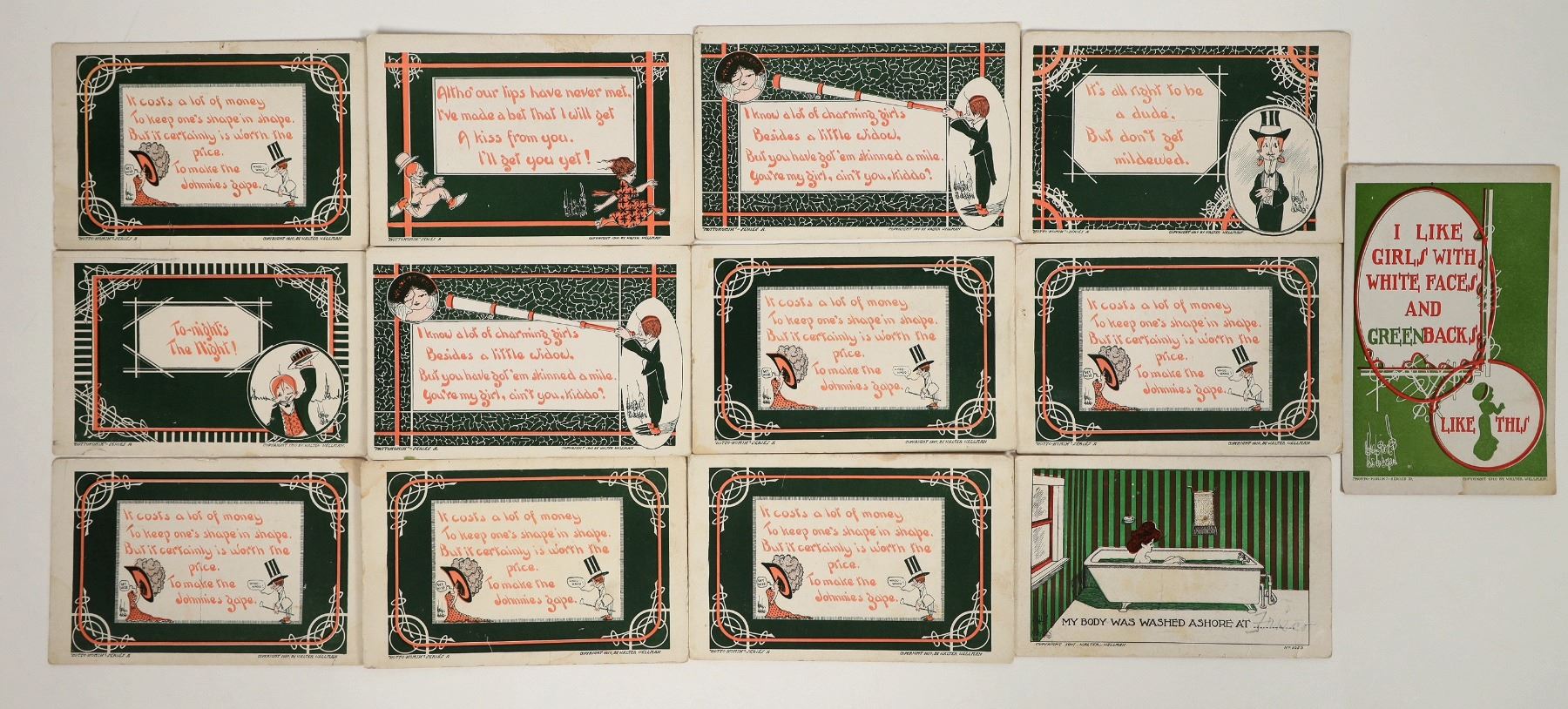 Lot of 13, with duplication. All copyright Walter Wellman, 1910. Motto Komik Series. One is 1907, mailed. Playful tones.