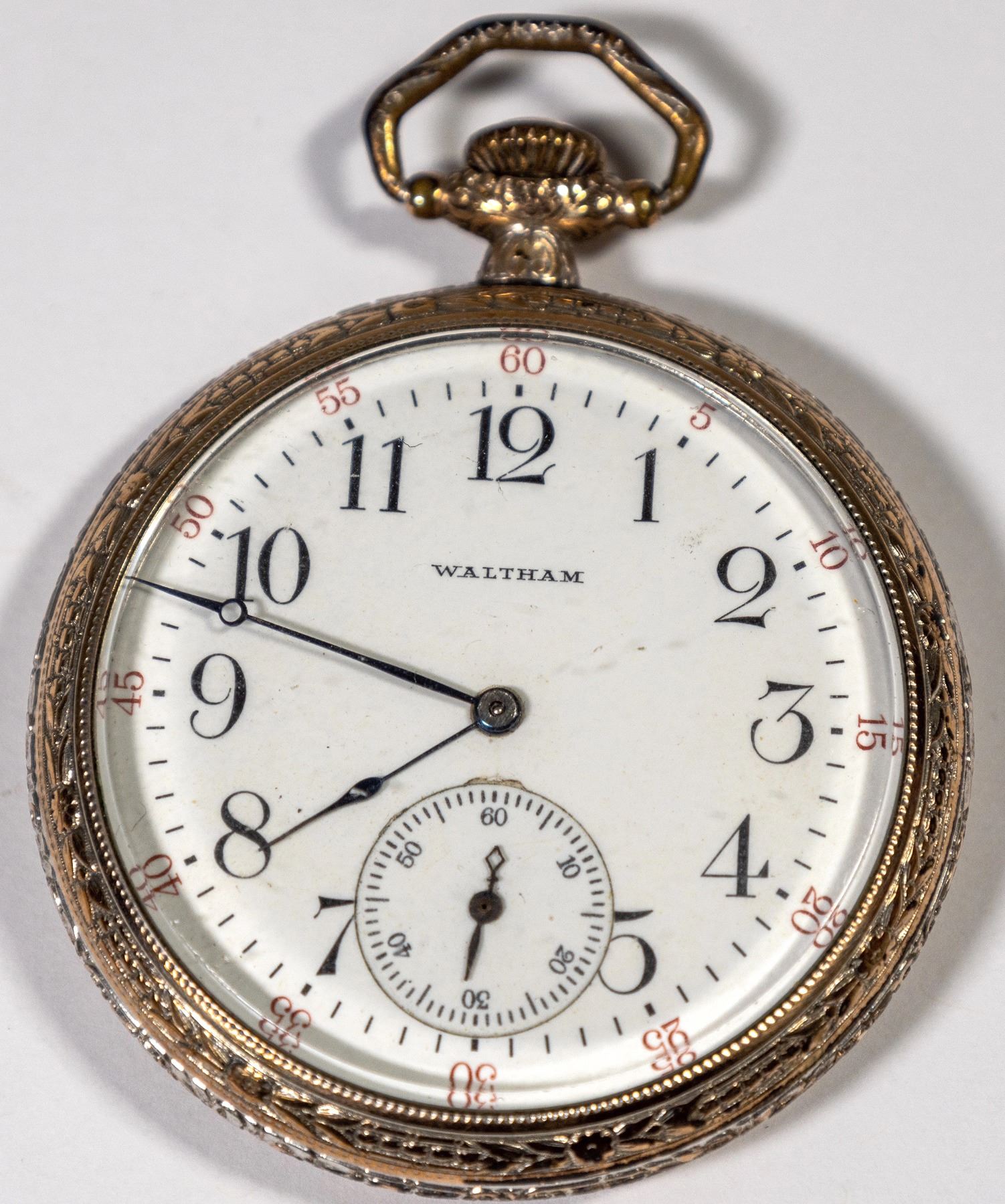 American Waltham Watch Co. 14Kt gold open face pocket watch. This watch has fancy detailing all the way around on the bezel. The porcelain dial features a sunken seconds dial at the 6 o'clock.