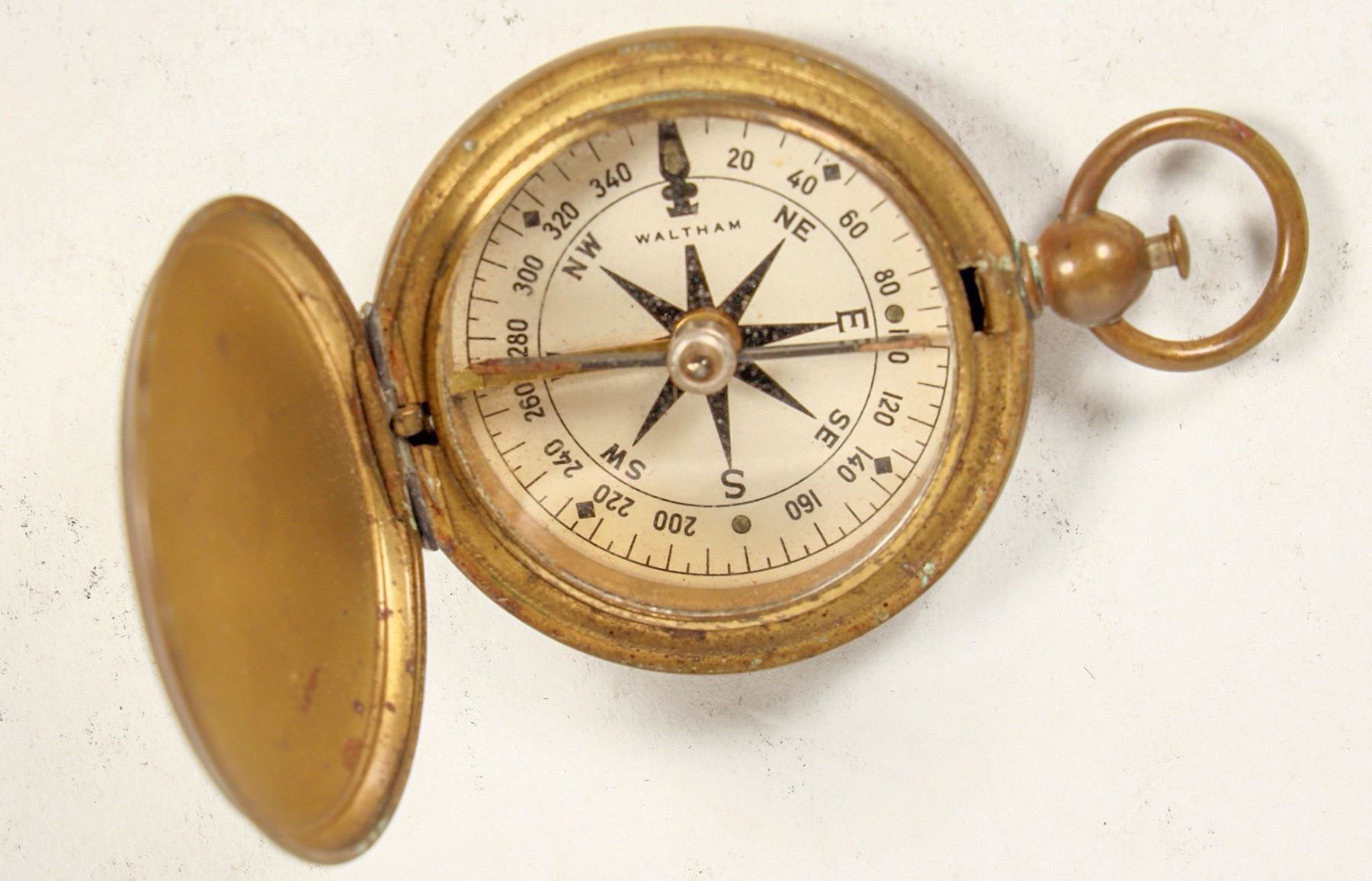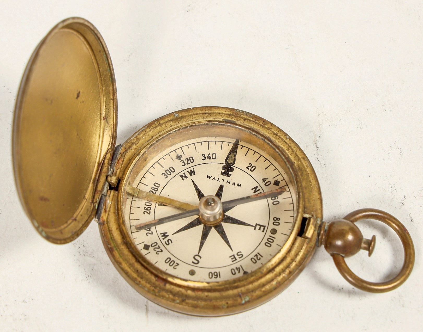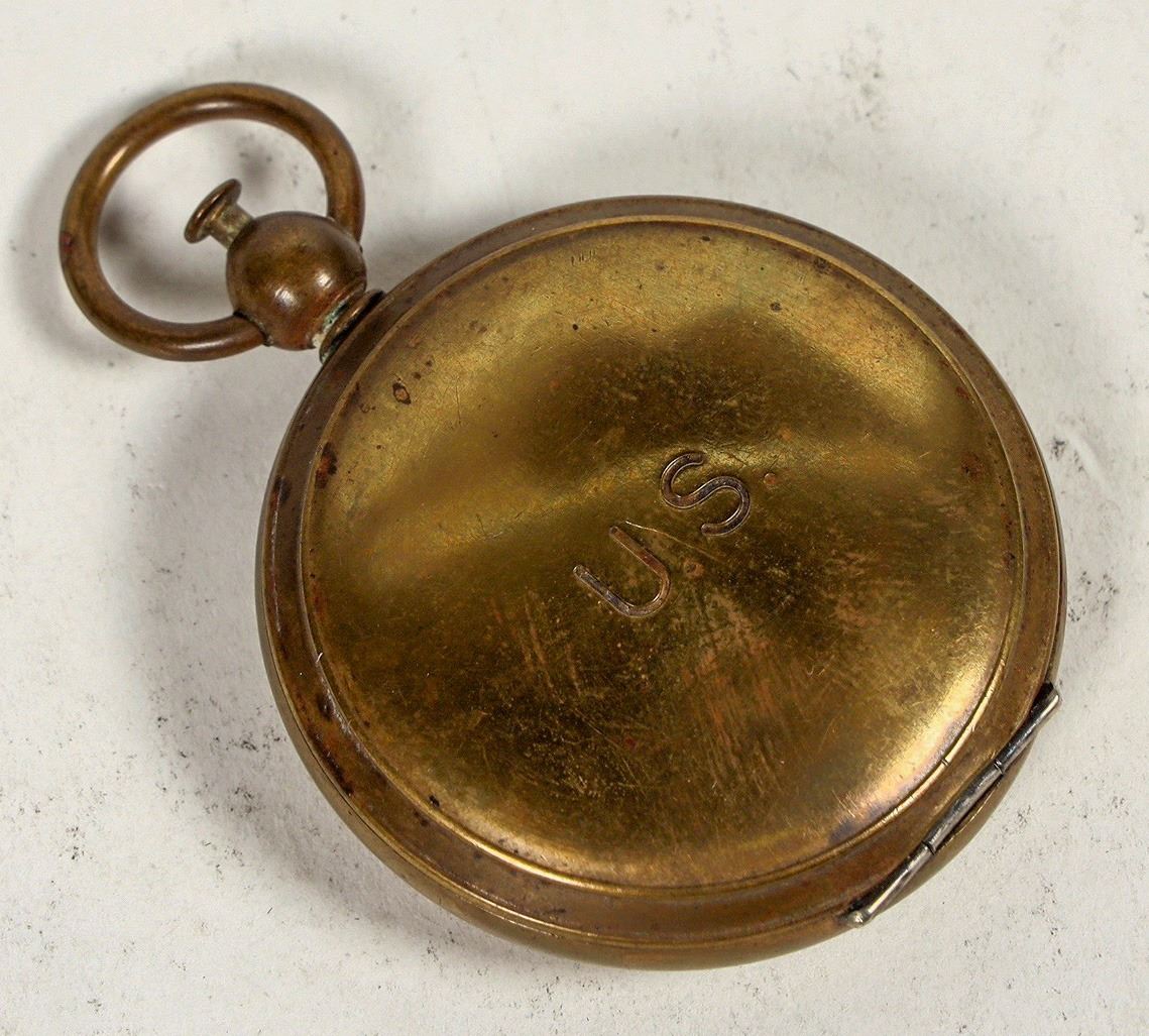 This is a Waltham brass pocket compass marked "US" on the top cover, WW1 vintage 1910. The needle is jeweled with stop that engages when the cover is closed. In minor dent in the top cover. Pocket watch style release button and bail. Tested: works perfectly with a quick needle. Please see photo for details.
