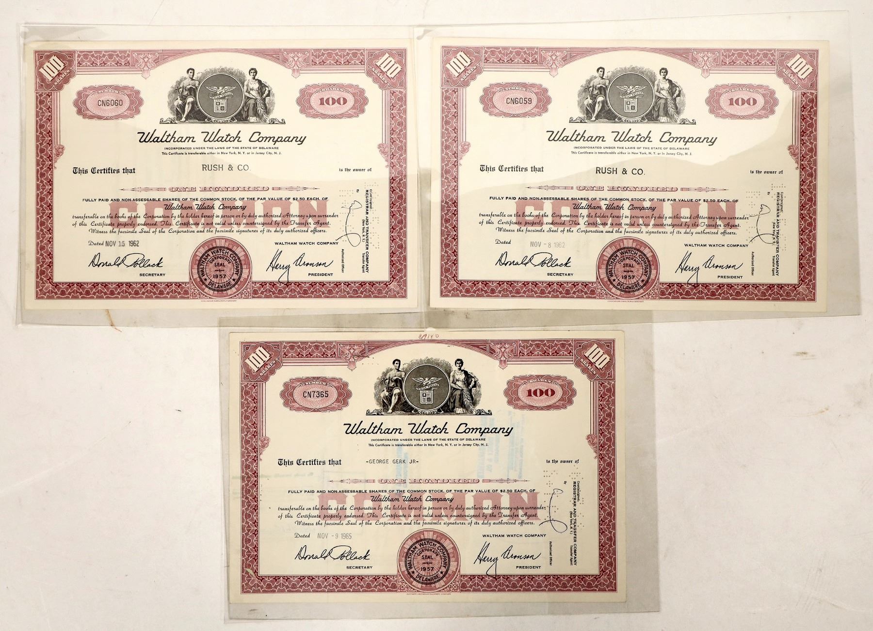 Three stock certificates, each for 100 shares in the Waltham Watch Company. Dated from 1962 to 1965. All three bear the seal of the company, the signatures of the company's secretary and president, and an engraved vignette. All three cancelled using punched holes. Good condition.