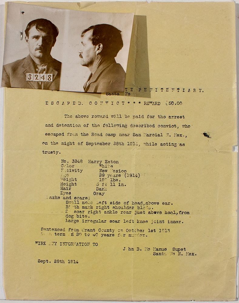 This is a wanted broadside for Harry Eaton who had just escaped from the state penitentiary. If it dated September 29, 1914. IT is a copy of the original and includes original photographs (3 x 2"). Issued by warden John B. McManus. Eaton escaped form a road camp near San Marcial on the night of September 28, 1914 "while acting as a trusty." He was in the pen for the murder in Grant County and was sent to the pen on October 1, 1913. His prisoner number was 3248. (It was received in an original envelope addressed to City Marshall, Lordsburg, N. M. making this an authentic piece.)