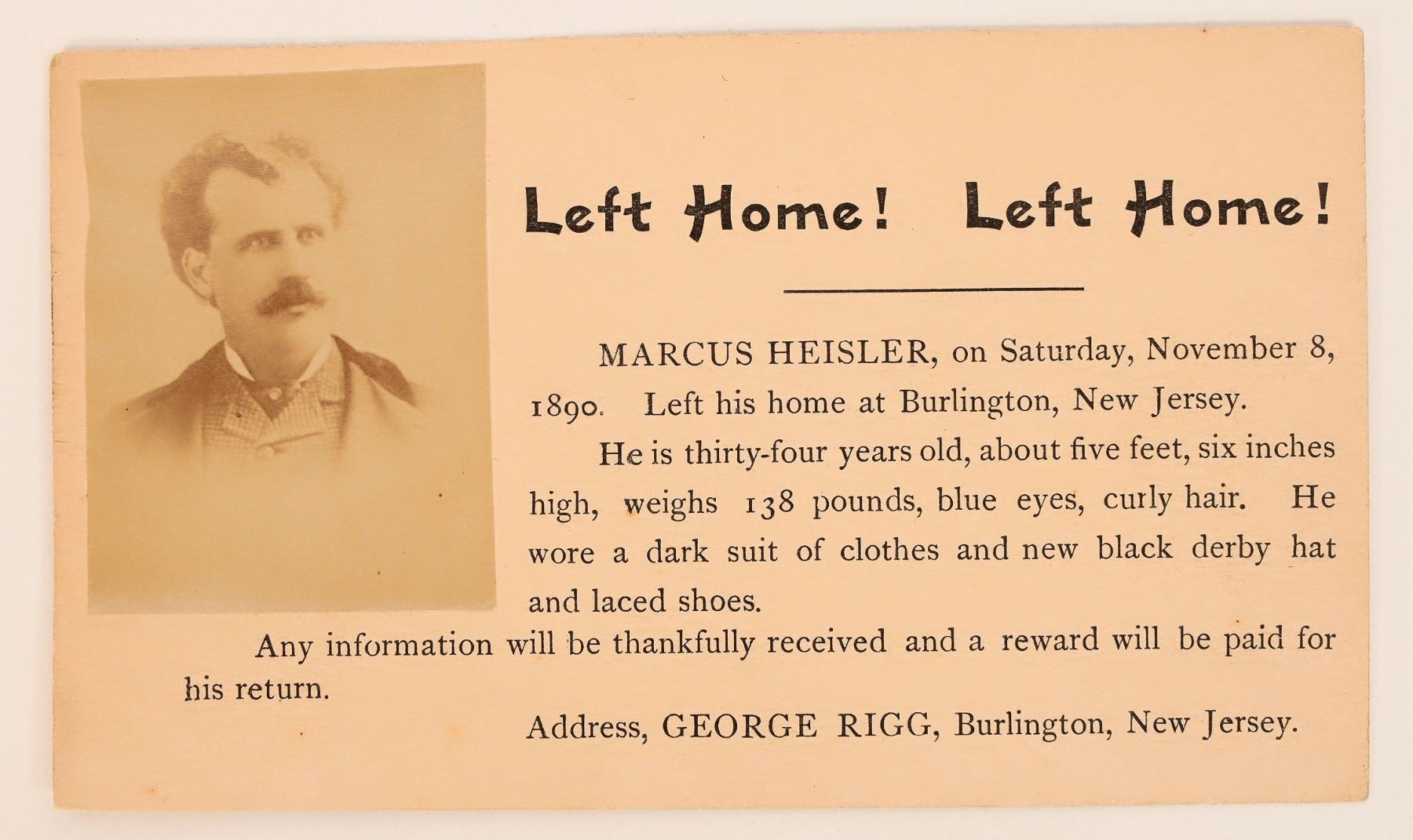 RARE "wanted" or missing person postcard, c1890. Titled "Left Home! Left Home!" Original photo of Marcus Heisler attached. Reward offered.[ Burlington New Jersey