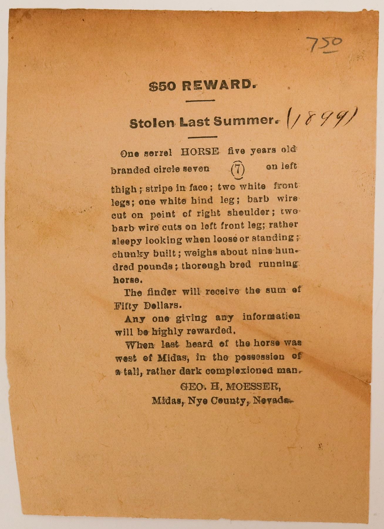 Midas, Nevada, 1899, wanted poster, without photo, for stolen horse. Although Midas, a Nye County town, has been listed as a ghost town but has always had a least a few inhabitants. About 4 by 5.5 inch poster includes $50 reward, and horse description as well as description of man last seen with the horse.