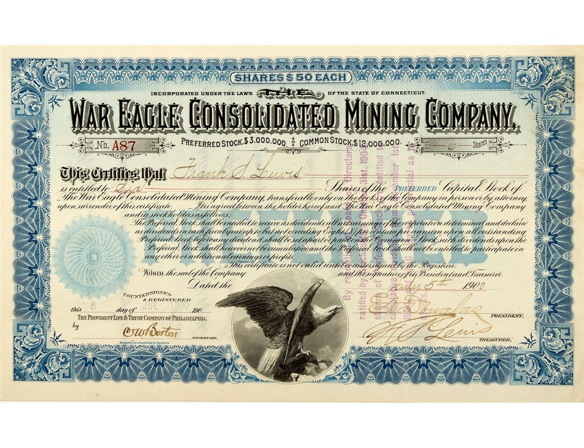 Measures 11 _ îx æ7î. Incorporated in Connecticut. ææStock number A 87 for 6 shares issued to Frank S. Lewis on July 5, 1900. Signed by Secretary C.W. Burton. Treasure F. S. Lewis. President E. A. Douglas. Blue border and black print. Embossed seal on the left side. æææVignette of a perched eagle in the lower middle side. æTwo folds. æA purple stamp mark on the front right side reads ñBy resolution of Board of directors ratified by the stockholders. October 31, 1904 shares of Preferred Stock are entitled to cumulative dividends from November 1st 1904 and shall also be preferential as assets.î æU/C. Date 1900 , CO hwac 10031