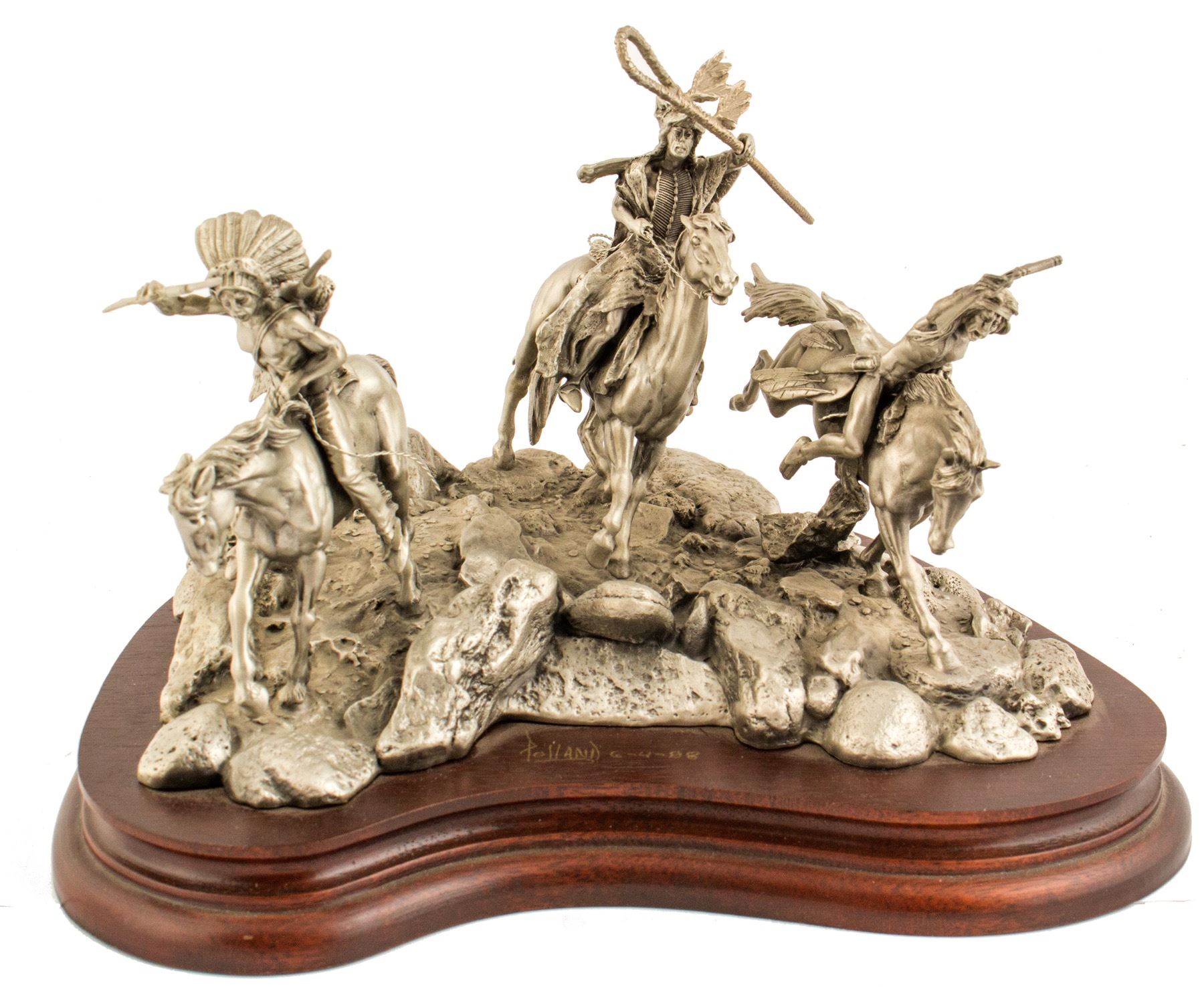 "War Party", Pewter by Don Polland, sculptor. 618/2300. War Party depicts three warriors, one in bear costume, racing along with weapons drawn. 6" x 8" x 6.5", on wood base. Chilmark Fine Pewter. State: California City: HWAC#: 48009 Date: 1980