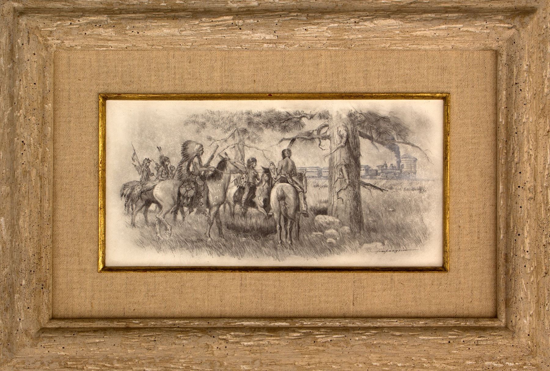 "War Party Watching Train" by Frank Magsino. Pencil drawing of group of Indians (war party) watching a train in the distance. Magsino's drawings ar as detained as his acrylic paintings. Drawing, 6" x 12". Linen liner and frame, 13.25" x 19.5". State: California City: HWAC#: 47567 Date: