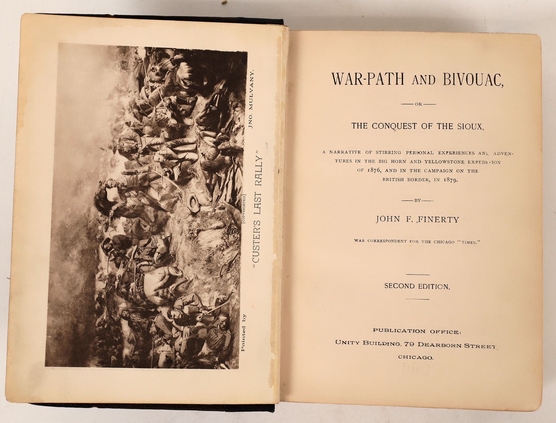 Second edition copy of "War-Path and Bivouac" The Conquest of the Sioux by John F. Finerty. Copy has slight board damage, slight water staining , but a very strong spine and intact map. Finerty was a reporter for the Chicago Times and also served in Congress representing Illinois. 1879