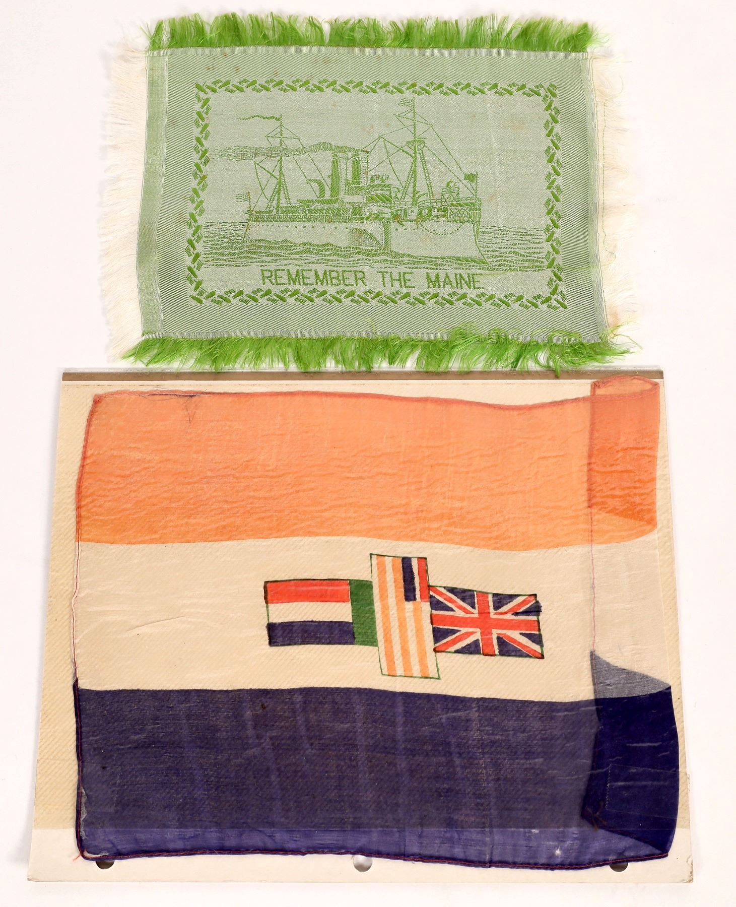 2 old war silks. Green, Remember the Maine, 7x9.25". Red, white , blue flag with Union Jack, French flag and sort of US flag in center, 8x11" with grease.