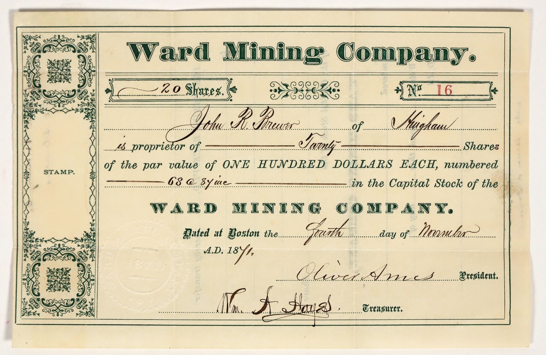 Very rare and early for Ward, Boulder County, Colorado. No. 16, issued for 20 shares to John R. Brewer in Boston in 1871. Signed by president Oliver Ames and treasurer Hayes. Not cancelled. Simple design with green print, no vignette. 5 x 7.5" Operated on the Manhattan and Columbian Lodes. Had a 20 stamp mill at Ward.