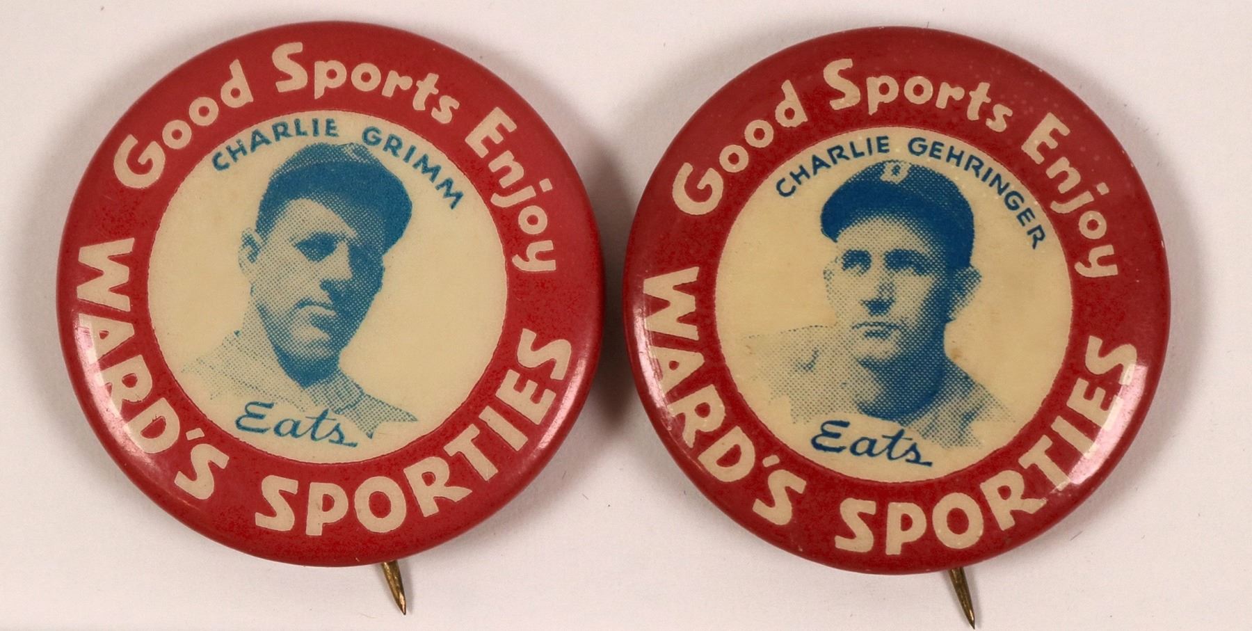Ward's Sporties is a set of 8 pins issued in 1934, by a Depression era bakery. 31 mm buttons. Here are two of them: Charlie Grimm (nicknamed "Jolly Cholly" his ashes were spread on Wrigley Field) and Charlie Gehringer. (Charles Leonard Gehringer, 1903 – 1993, nicknamed "The Mechanical Man", was a second baseman for the Detroit Tigers, for 19 seasons (1924–1942). He was elected to the Baseball Hall of Fame, in 1949.)