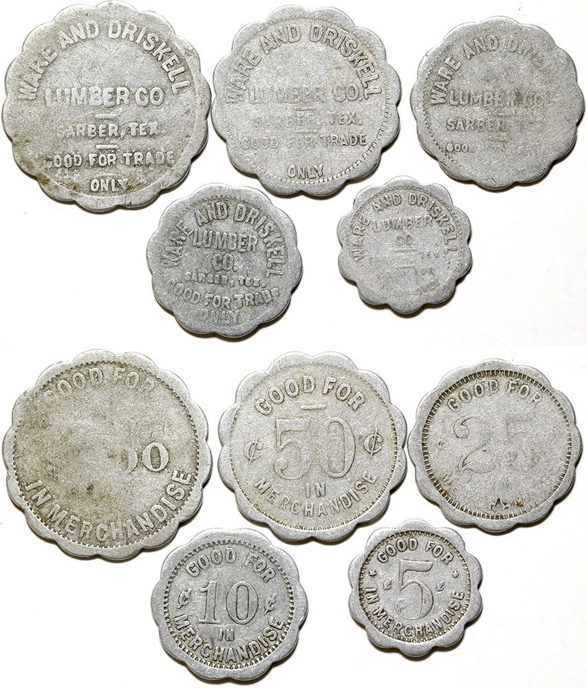 Four tokens (5c, 25c, 50c, 1.00) from a larger lumber town HWAC# 62727 Date: Location: Sarber, Texas