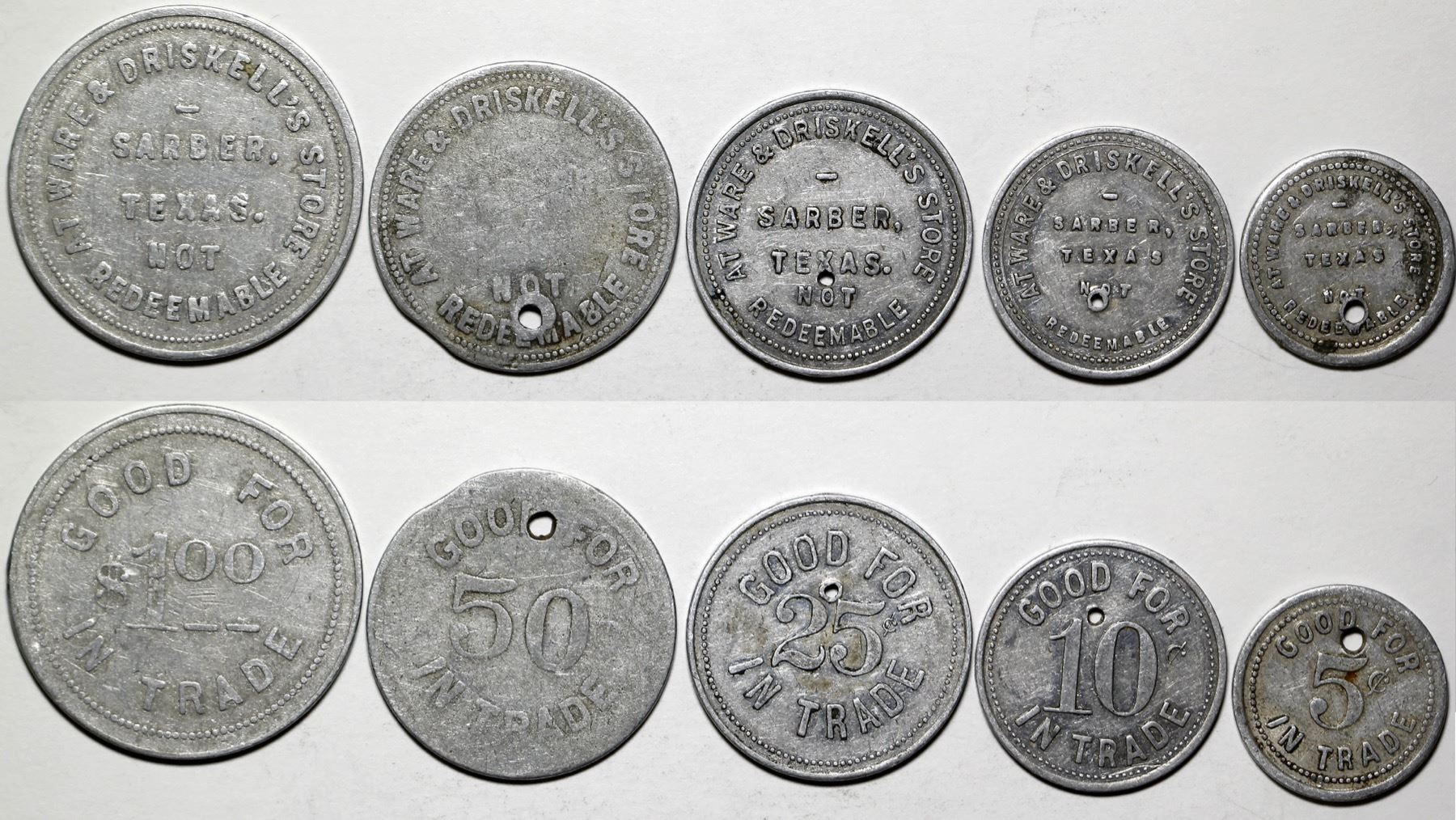 Set of five GR tokens from Ware & Driskells Store. 5c, 10c, 25c, 50c, $1.00, all but $1.00 holed. State: Texas City: Sarber Date: HWAC# 85430
