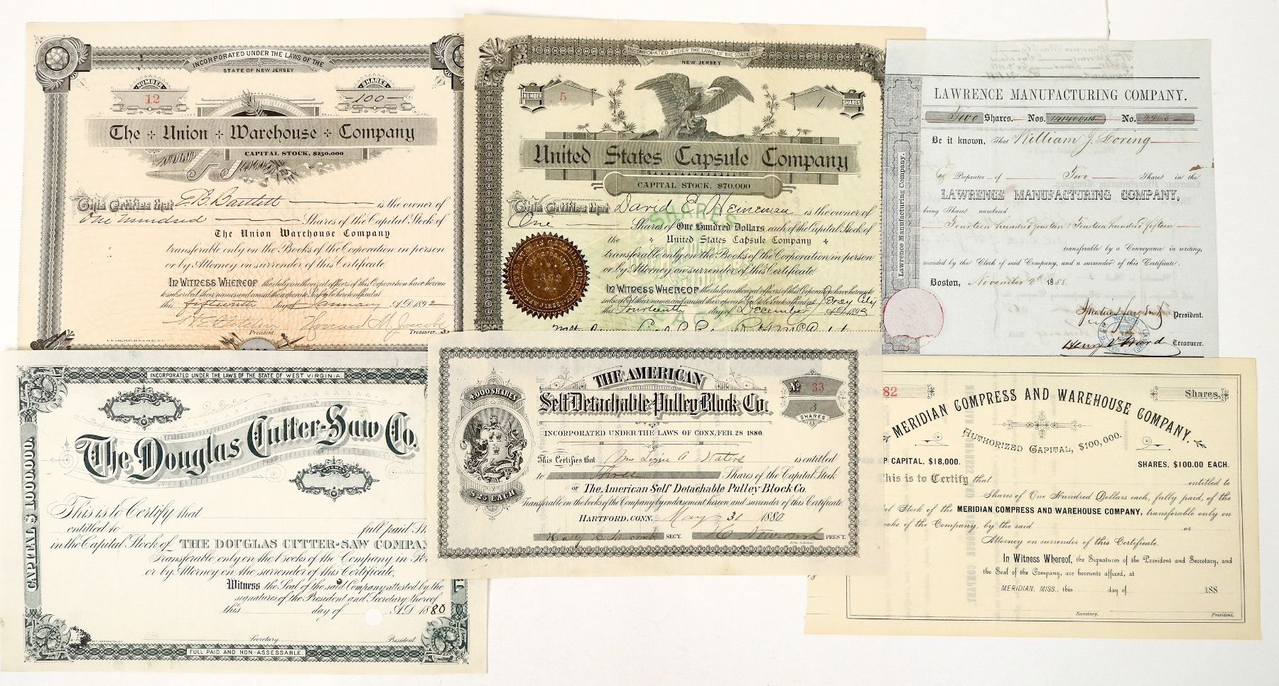 A group of six stocks related to warehousing, dating from the 1850s to the 1890s. The companies represented in the lot are Meridian Compress and Warehouse, United States Capsule, Douglas Cutter-Saw, Lawrence Manufacturing, Self-Detachable Pulley Block, and Union Warehouse. Two are unissued; the other four are signed by the president and secretary of their respective companies. Good condition.