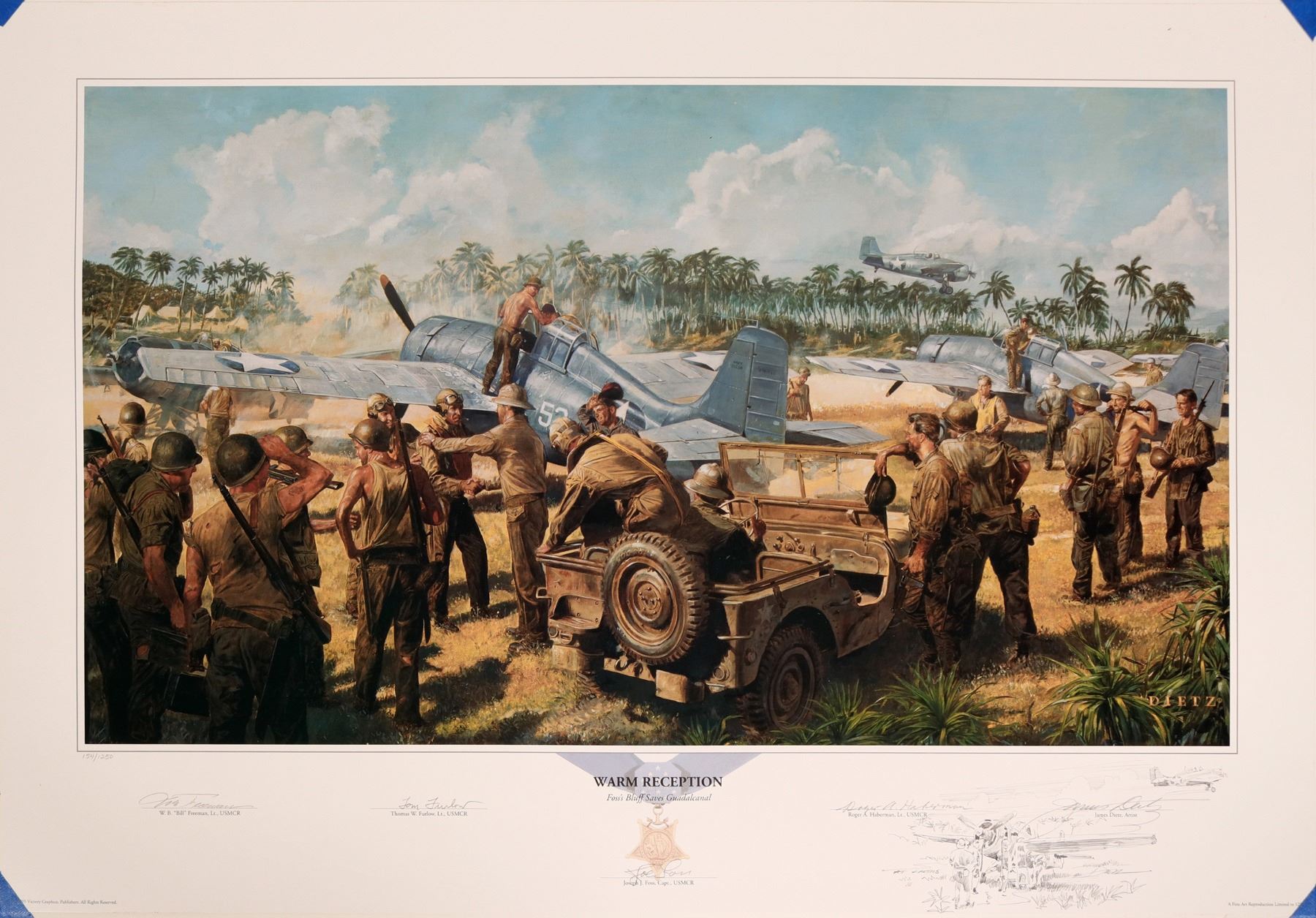A tribute to proud Americans, this unique limited edition print is signed by the artist, and personally autographed by Joseph J. Foos, Capt., USMCR and three surviving members of Foss' Flying Circus VMF-121: W.B. "Bill" Freeman, Lt., USMCR; Thomas W. Furlow, Lt., USMCR; and Roger A. Haberman, Lt., USMCR.