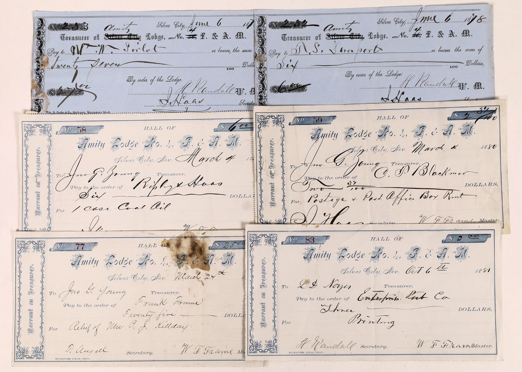 Lot of six. 1. Two bearer warrants #232 &233. Issued June 6,1878 Silver City, Nev. by Treasurer. Black print on blue paper, scroll vignette left border.. Printer Wm. B. Cooke & Co, Stationers. 2. Four Treasurer Warrants, Amity Lodge No 4, Silver City, Nev. #58& 59, 77 and 83. Issued 1880 and 1882. Blue border on white paper. No vignette. Warrants 77 & 83some staining, no tears. 58 & 59 have small punch hole left side.