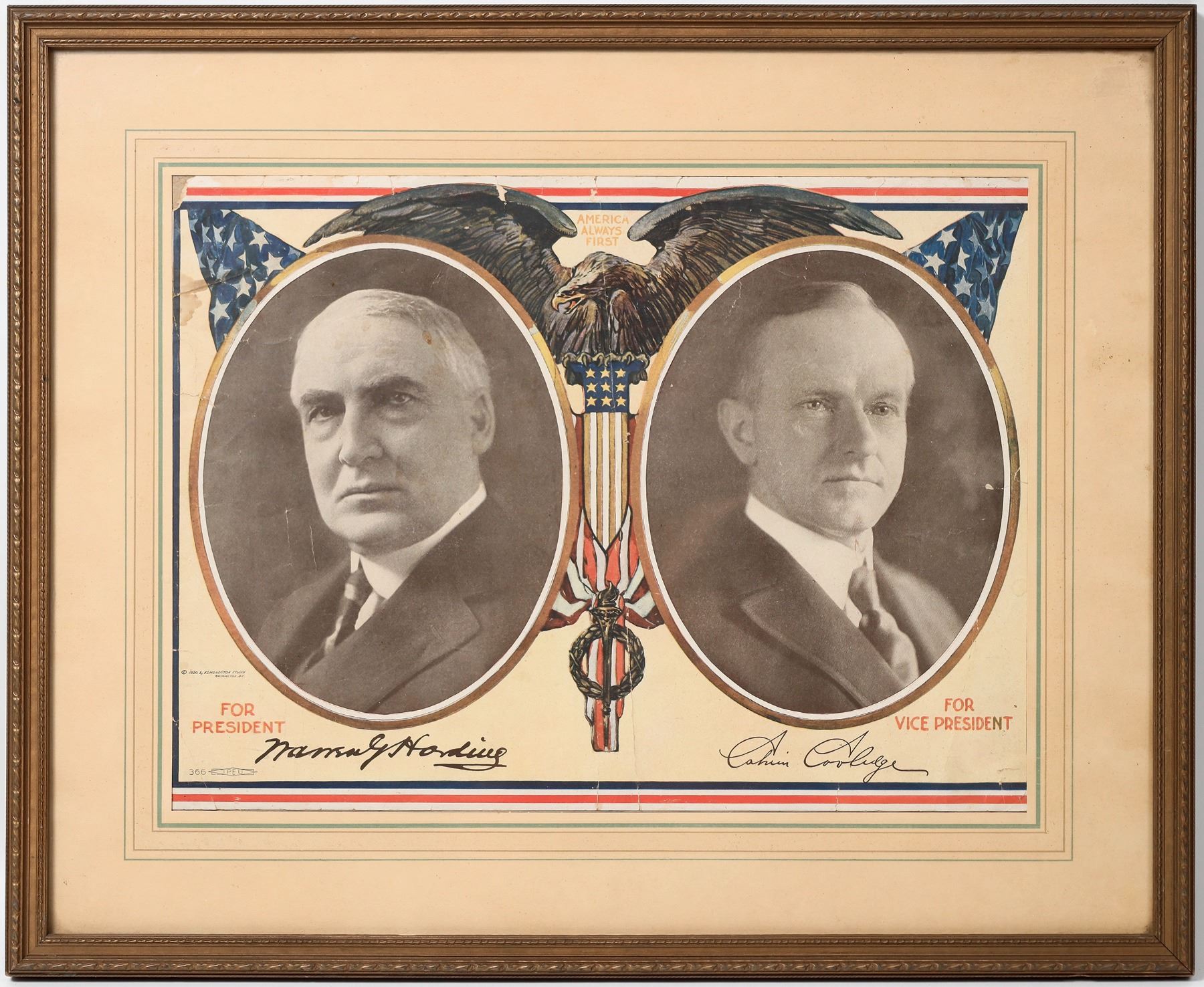 Warren Harding and Calvin Coolidge printed and framed sign, 1920. By Edmondston Studio, Washington, DC. Print 11.25x14", frame 17x21". Print has upper left chip, small left stain, creases, please inspect.