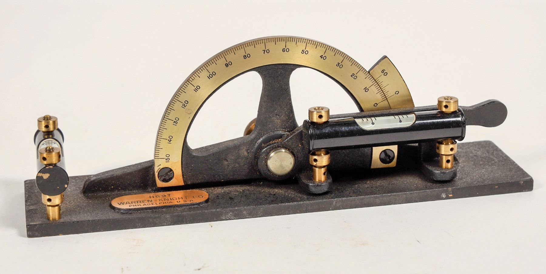 This is a cased Warren-Knight Clinometer model #203 S/N 11697 with original paper and wood case. Both vials of levels are in working order. In excellent condition. This tool is used in survey and excavation work. Please see photo for details.