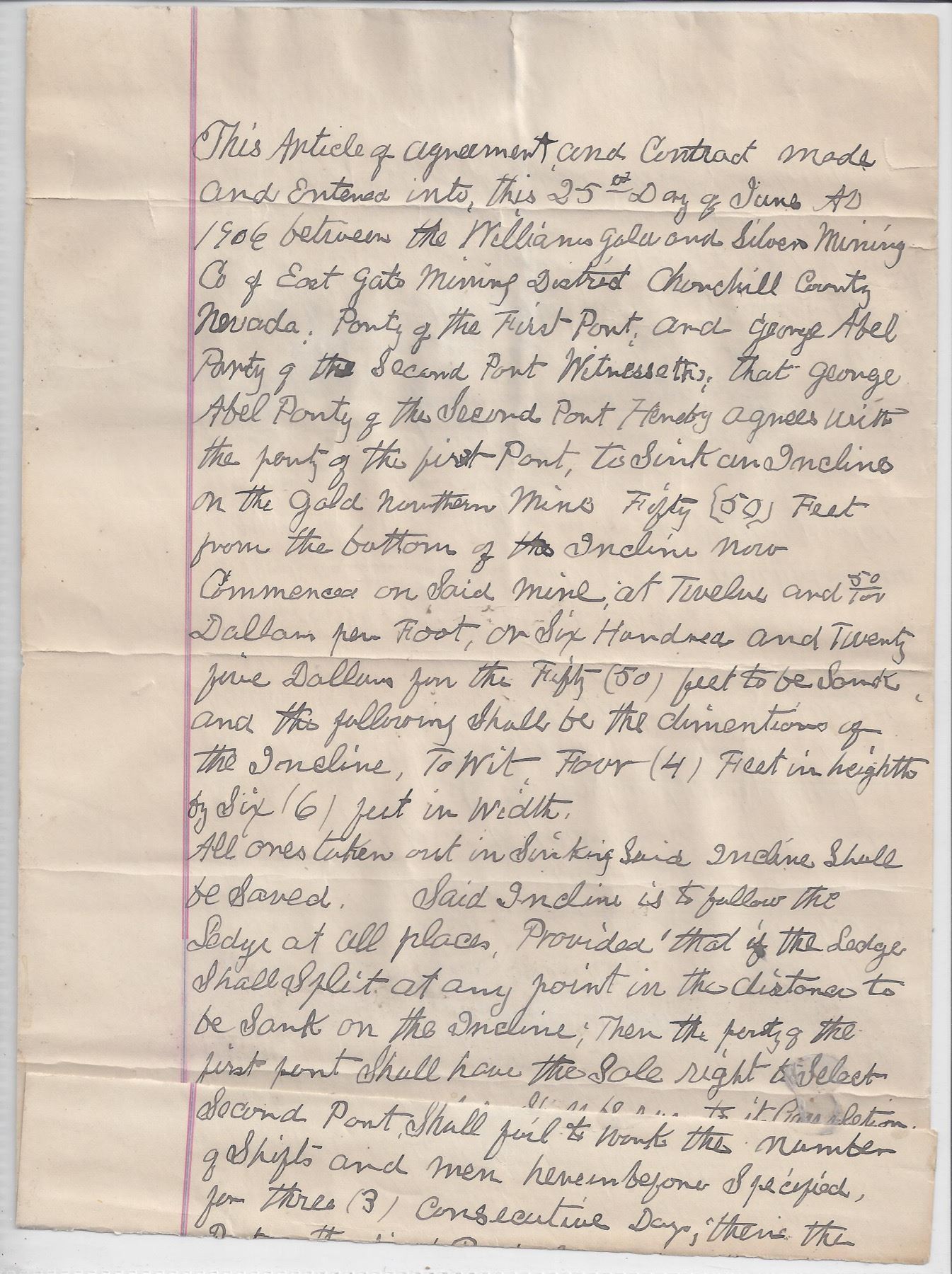 Mine Contract: This 1906 contract is between the owner George Williams and George Abel to sink a shaft into the Gold Northern Mine at $12.50 a foot. George's father Warren was the owner and president. Three handwritten, legal sized papers. Signed by vice president George Williams and George Abel.