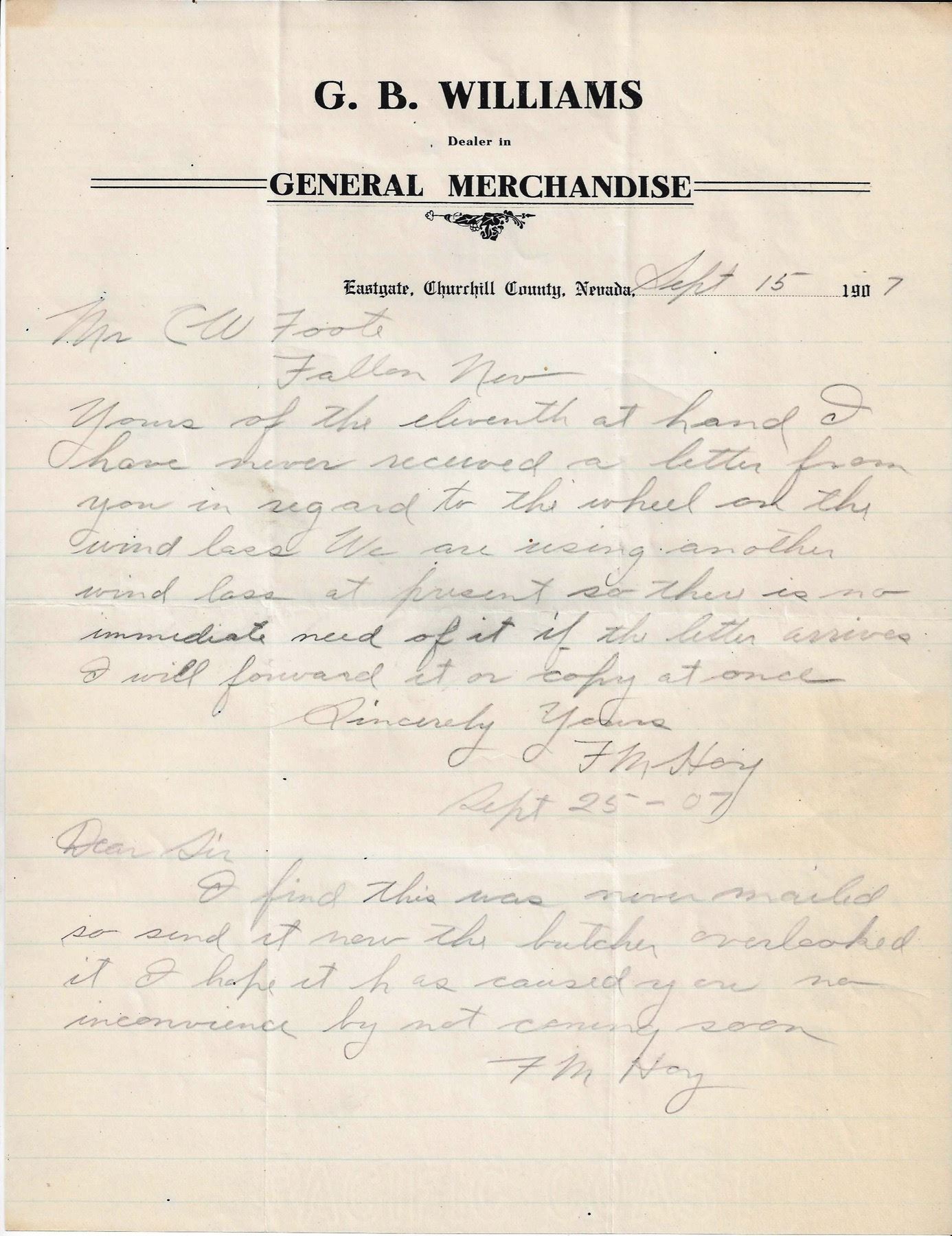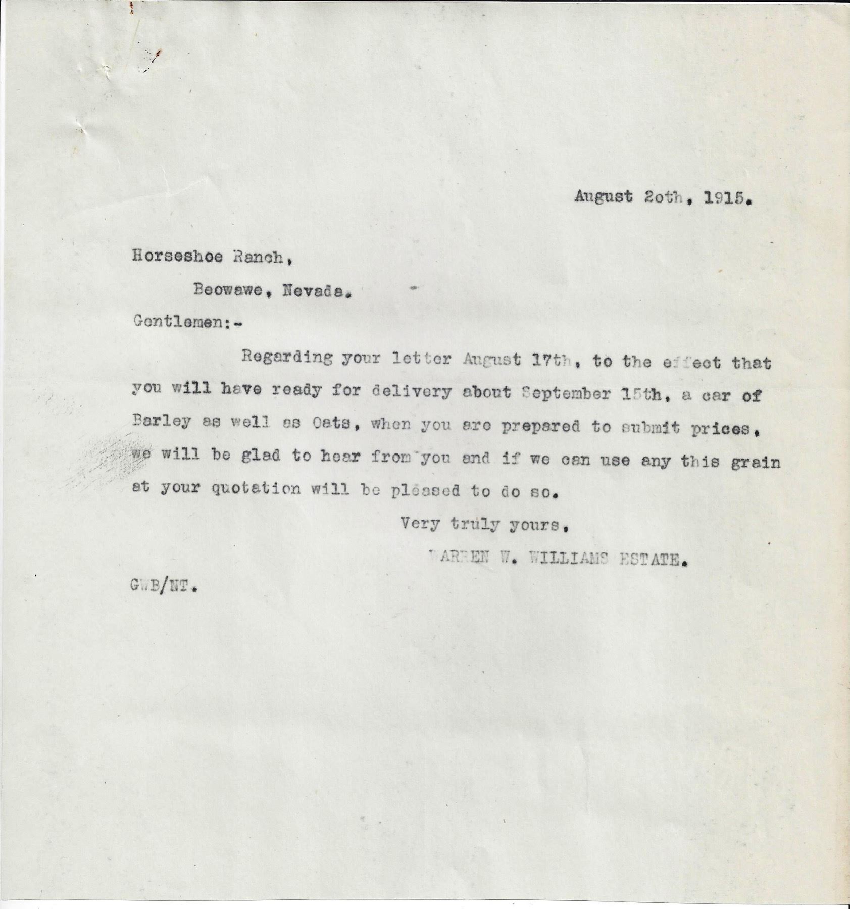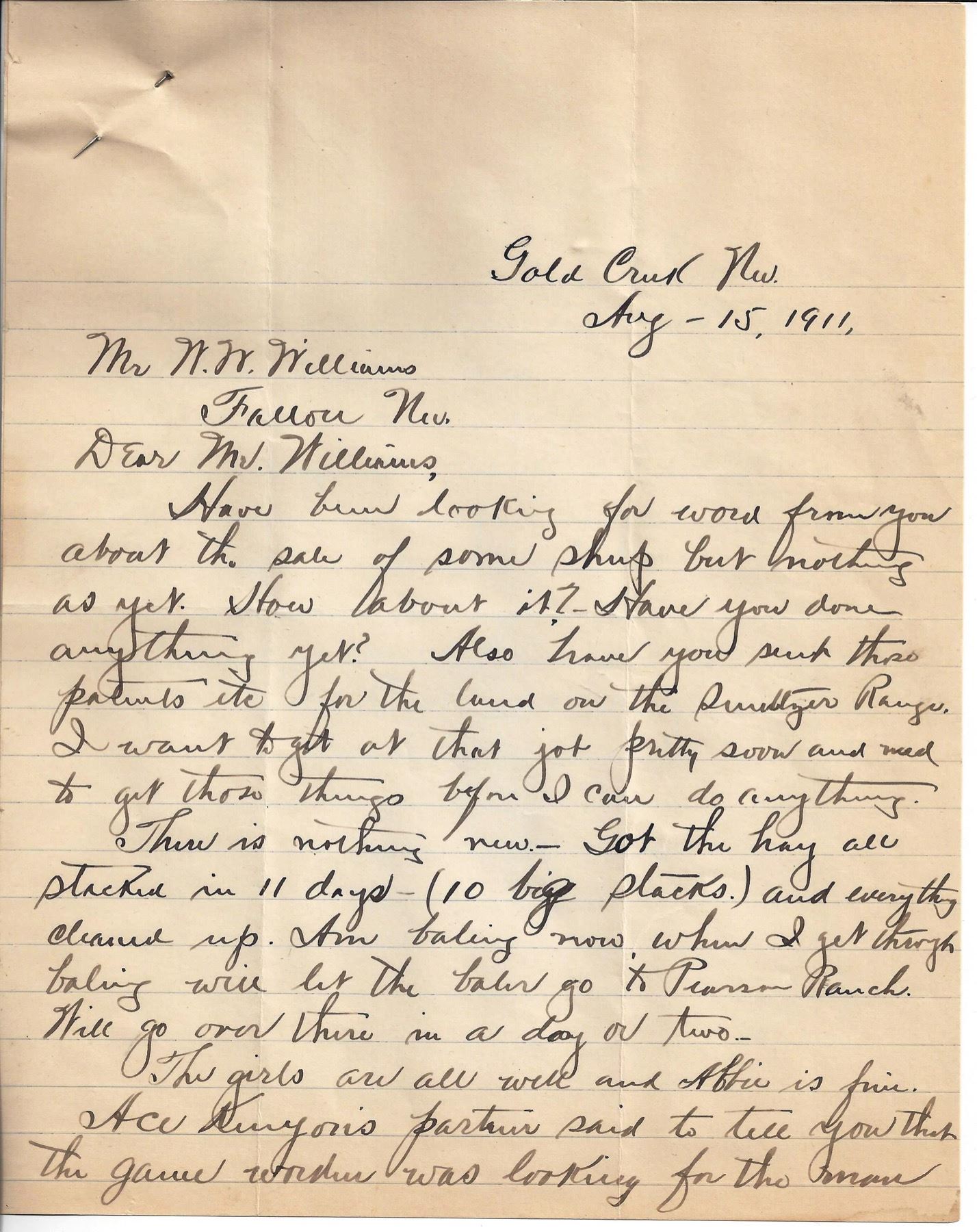 Warren Williams Mine Contract, Ranching Correspondence and Tract Purchases in Fallon