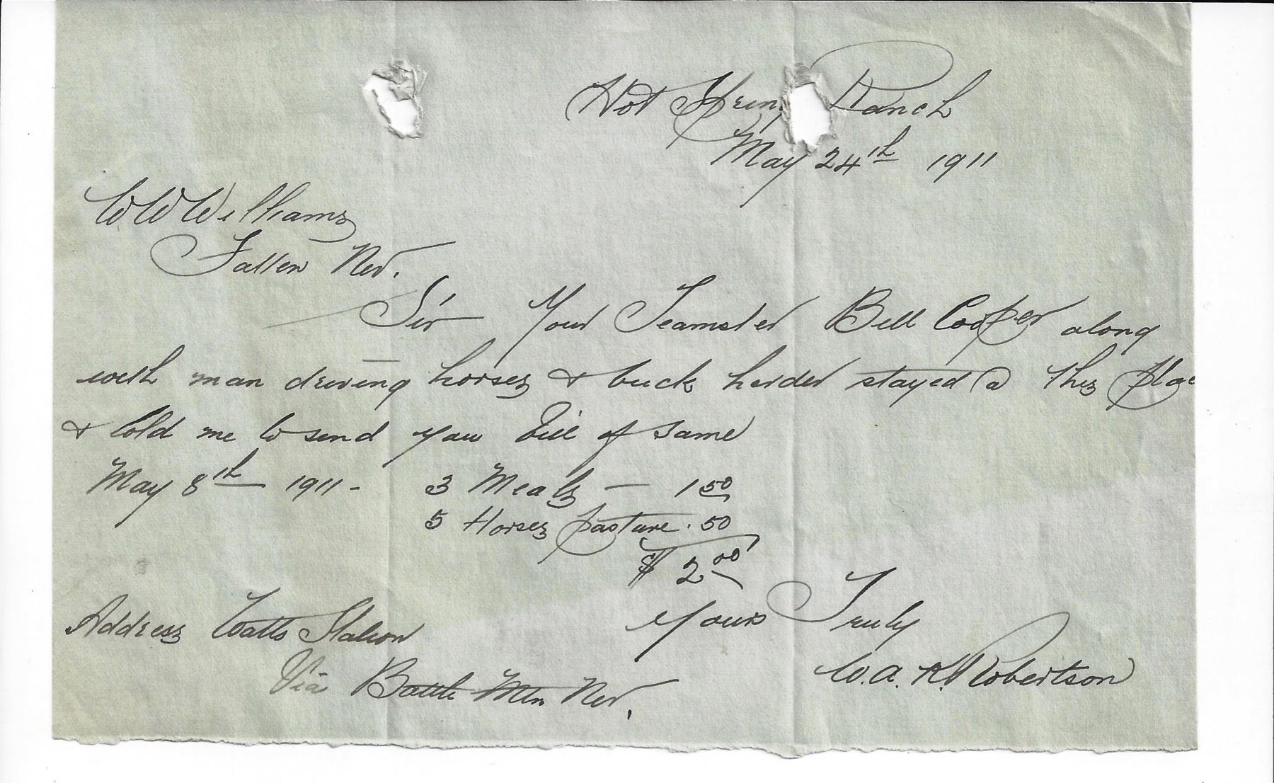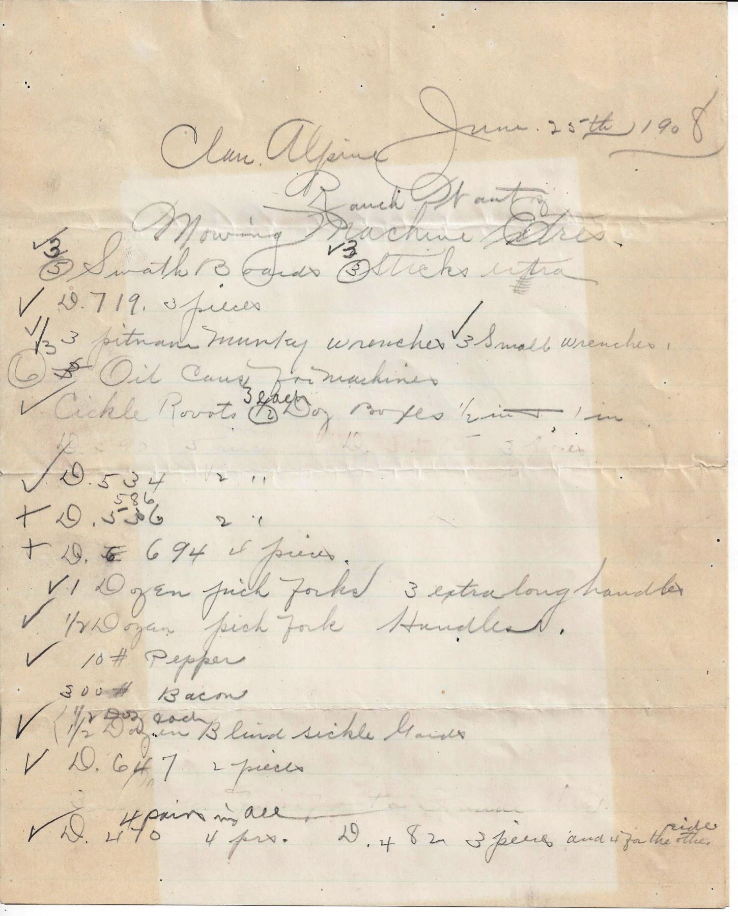 Ranching Correspondence. c1908-1915. Lot of 21. Includes correspondence from ranches at Clan Alpine, Alpine, Eastgate of Churchill County. The Argenta Ranch in Pershing County, the Hot Creek Ranch in Lander County, the Gold Creek Ranch in Elko County, etc. Includes a teamster note from Watts Station, via Battle Mountain. Watts Station was a stage stop in the 1870's and also a ten-car siding on the Nevada Central Railroad. Also known as Hot Springs. Art Keddie at Gold Ranch is looking to sell some sheep. "Plenty of sheep on the 25 Ranch range," says another. The Beowawe Ranch reports on grain and hay. The Holland Ranch is short on mower extras. The Horseshoe Ranch is willing to sell its scrappers (ditch digging tool), barrows, etc to Williams. The North Fork Ranch in Elko County reports the tractor has been doing fine. A great Eastgate letterhead. There is a time sheet from the Alpine Ranch for ranch hands and sheep herders, cooks and hay men, etc.. Etc. Notes on some of the ranches.
