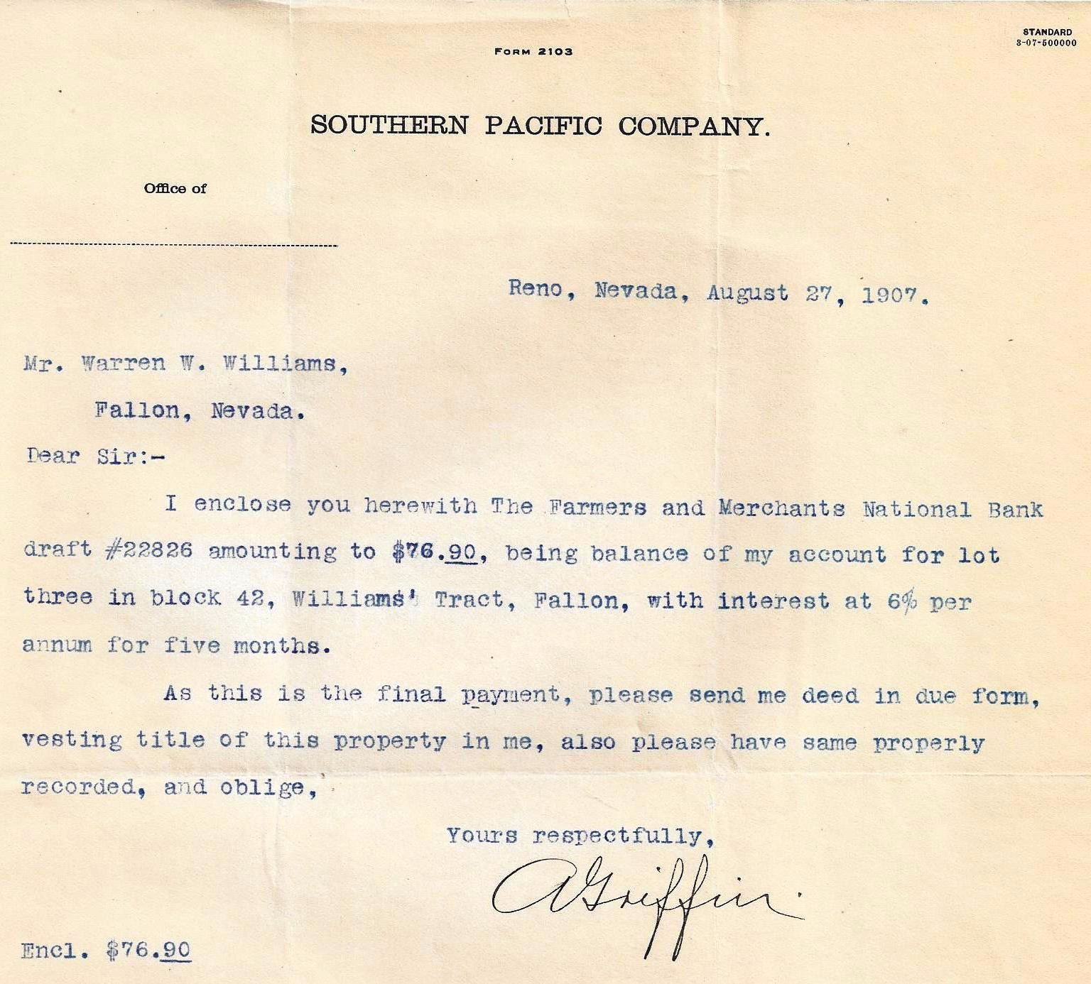 Tract Purchases: Nearly 100 pieces of paper pertaining to purchasing lots in the Williams Tract at Fallon, Nevada. Warren Williams was the founder of Fallon, the Nevada Senator how pushed through making it the county seat, getting the Southern Pacific to build a branch line to Fallon, was one of two major general merchants, and donated much of the land for municipal use. People buying land included George Willcutt Board of Directors for the South San Francisco Railroad, A Griffin, SP RR employee, Y Nobata a cook at a Susanville hotel, WJ Nimmer proprietor of the Golden Eagle Hotel in Sparks, William Black editor of the Churchill Standard, George Lofthouse who ran a saloon, James Young farmer, Thomas Means project engineer on the Truckee-Carson Project, Callie Ferguson of Black & Ferguson stationary store (with billhead), etc.. A real cross-section of people. State: Nevada City: Fallon, Churchill Date: HWAC# 99404