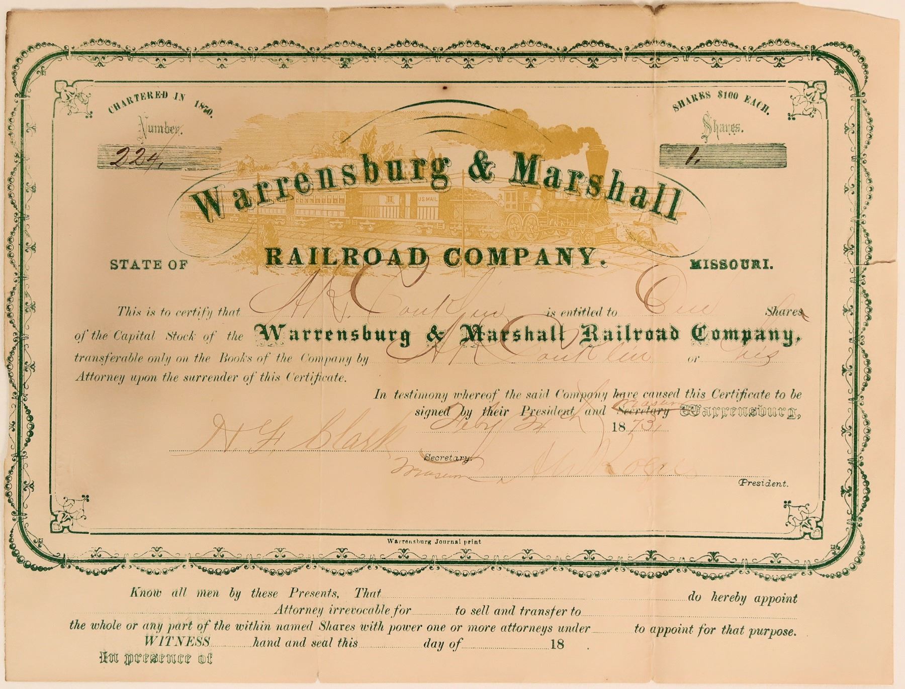 Incorp Missouri. #224, I/U, One share @ $100 issued Feb 24, 1973. Green, embossed seal, vignette ; 4-4-0 l-r yellow underprint. Power of Attorney attached. Warrensburg Journal printer. F