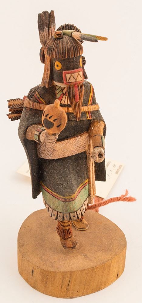 Warrior Maiden kachina by Preston Ami. 6.75" x 2.5" x 2.5". Note: feathers are missing from top of head, and handle of item held in left hand missing. Artist Preston Ami is from First Mesa(old Hopi Village) Northeastern Arizona Date: Location: Hopi, Arizona HWAC # 49318