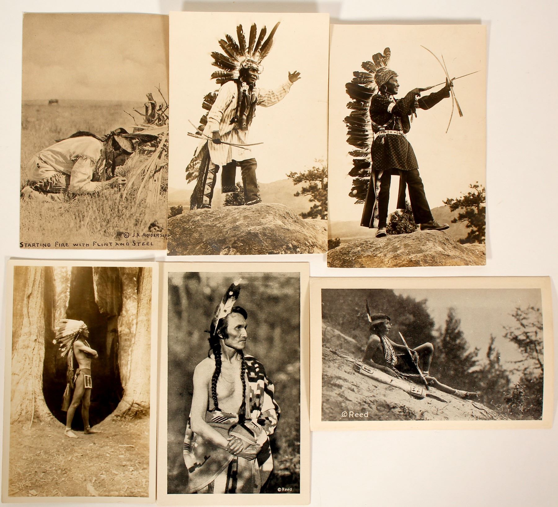 ND picked out these notable chiefs posing for photographers. Two by Paul Goerke & Son of Colorado Springs, two by Reed's Indian Pictures of St. Paul. Lot of six: three white border, one "starting fire with flint and steel."