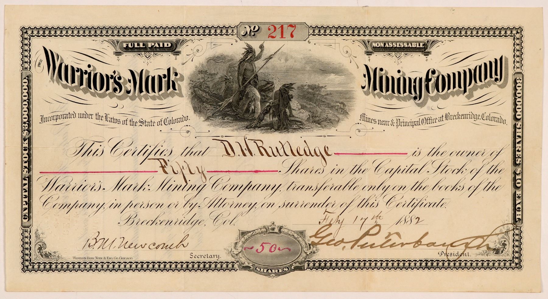 Inc. in Colorado. "Mines near & Principal Office at Breckenridge, Colorado" (printed under vignette). Dateline Breckenridge, Col. Feb. 17th. 1882. No. 217, issued for 50 shares to DH Rutledge. Signed by president George Puterbaugh and secretary B. Newcomb. Not cancelled. Black border and print, vignette of Native Americans looking down at locomotive. Printed by Western Bank Note & Engraving Co., Chicago. 5 x 9.5" Pinholes, folds, a few ink stains. Owned 9 claims: Warrior's Mark, Etna, Queer Name, Queer Name No. 2, and Cassandra Nos. 1, 2, 3, 4, and 5, on the west side of Indian Gulch, one half mile from Dyerville and seven miles from Breckenridge. Located in 1880. Much development described. [See: Corregan & Lingane, 1883, pg. 878] Ken Prag Collection