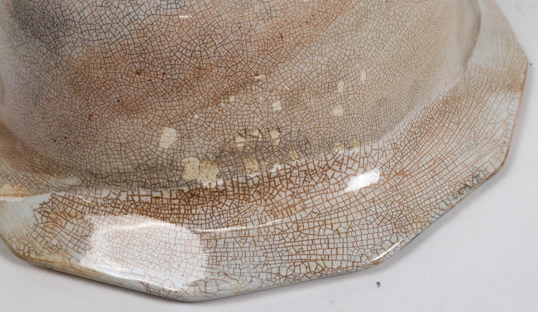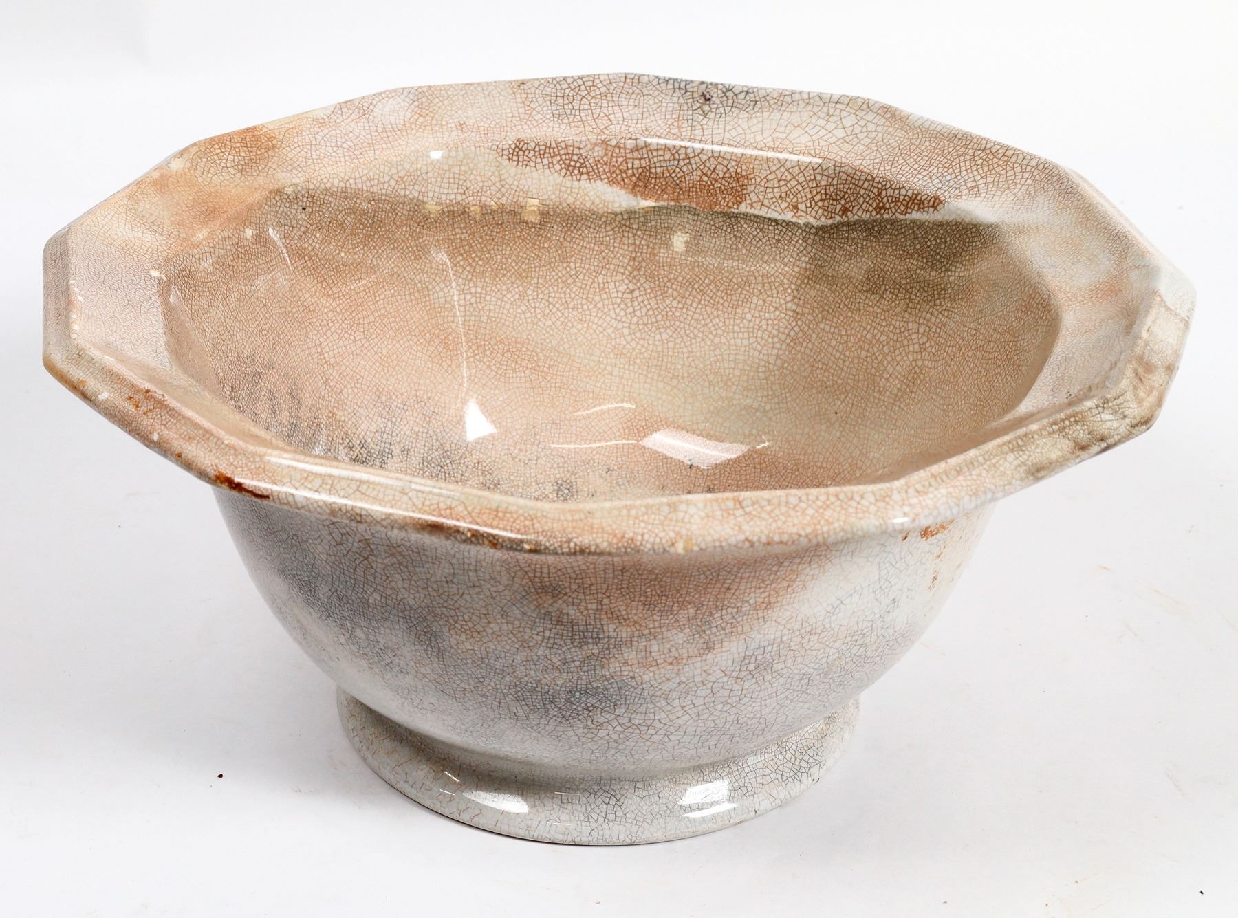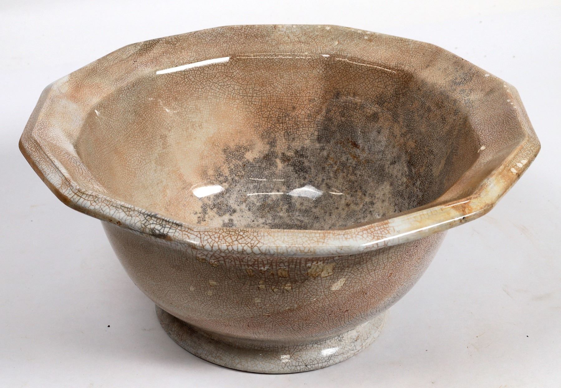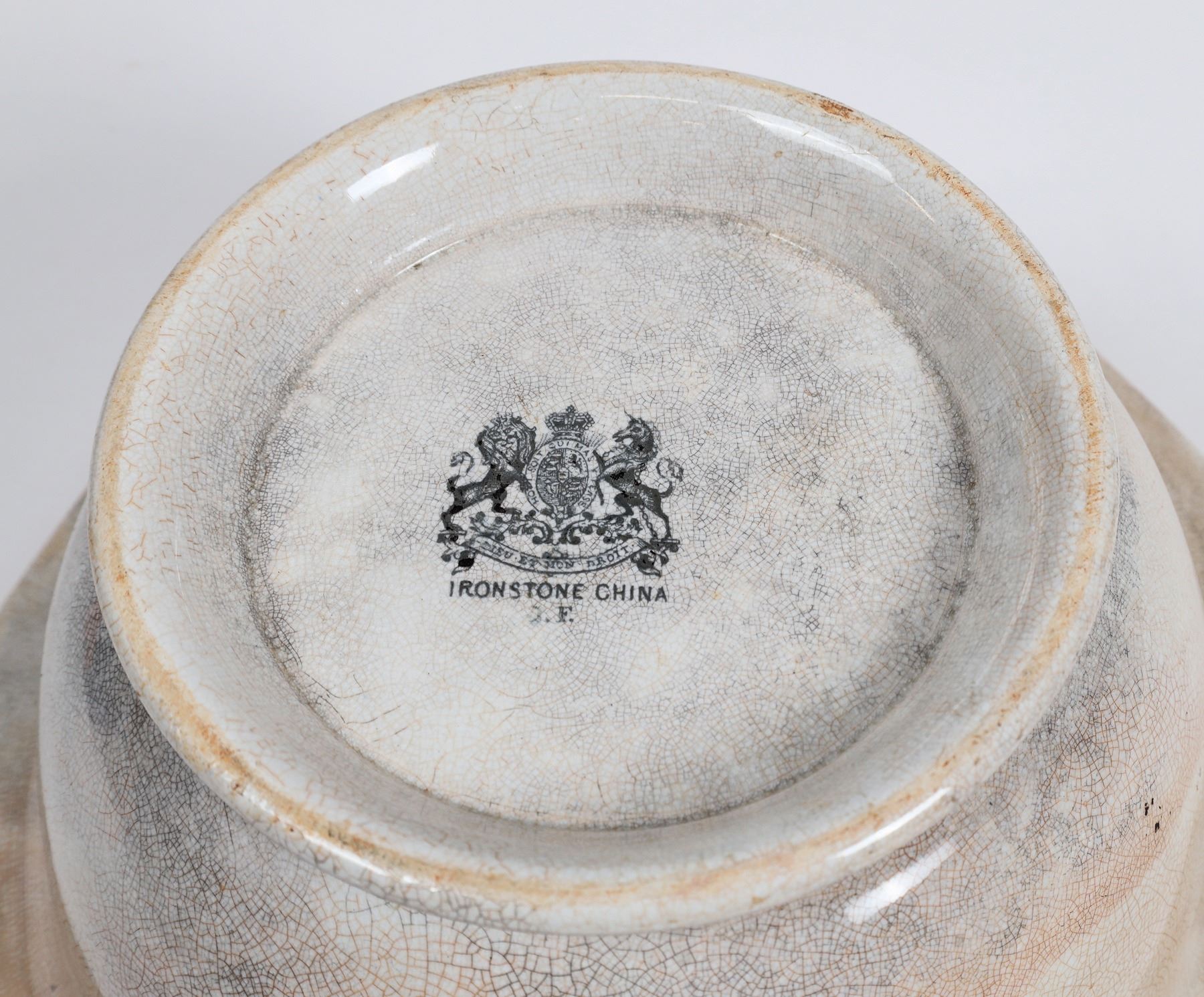 Ironstone wash basin recovered from the S.S. Central America shipwreck. It is 13 inches in diameter on top, 7 inches tall, and 6.5 inches in diameter at the base. Hallmark on base: A large emblem with a lion at left, unicorn at the right, crown in center over crest surrounded by: "Honi Soit Qui Mal Y Pence", Latin for "Shame on him who thinks evil of it." Bottom banner: "Dieu Et Mon Droi", Latin for "God and My Right". Bottom of emblem in old English print are the initials // J. F. //. This refers to J. Fernyhough, who was a china/ironstone manufacturer in Staffordshire, in partnership with J. Adams and S. Hartshorne, until October, 1853. (10/4/1853, Liverpool Mercury, and 10/7/1853, Coventry Standard). This piece may have been purchased as part of the initial outfitting of the ship for its maiden voyage in October 1853 as the SS George Law, the original name for the S.S. Central America. Condition in general is exemplary with the exception of the underside of an area that was apparently at a contact between two differing sediment layers on the ocean floor, such that the porcelain finish has chipped off in about a dozen areas.