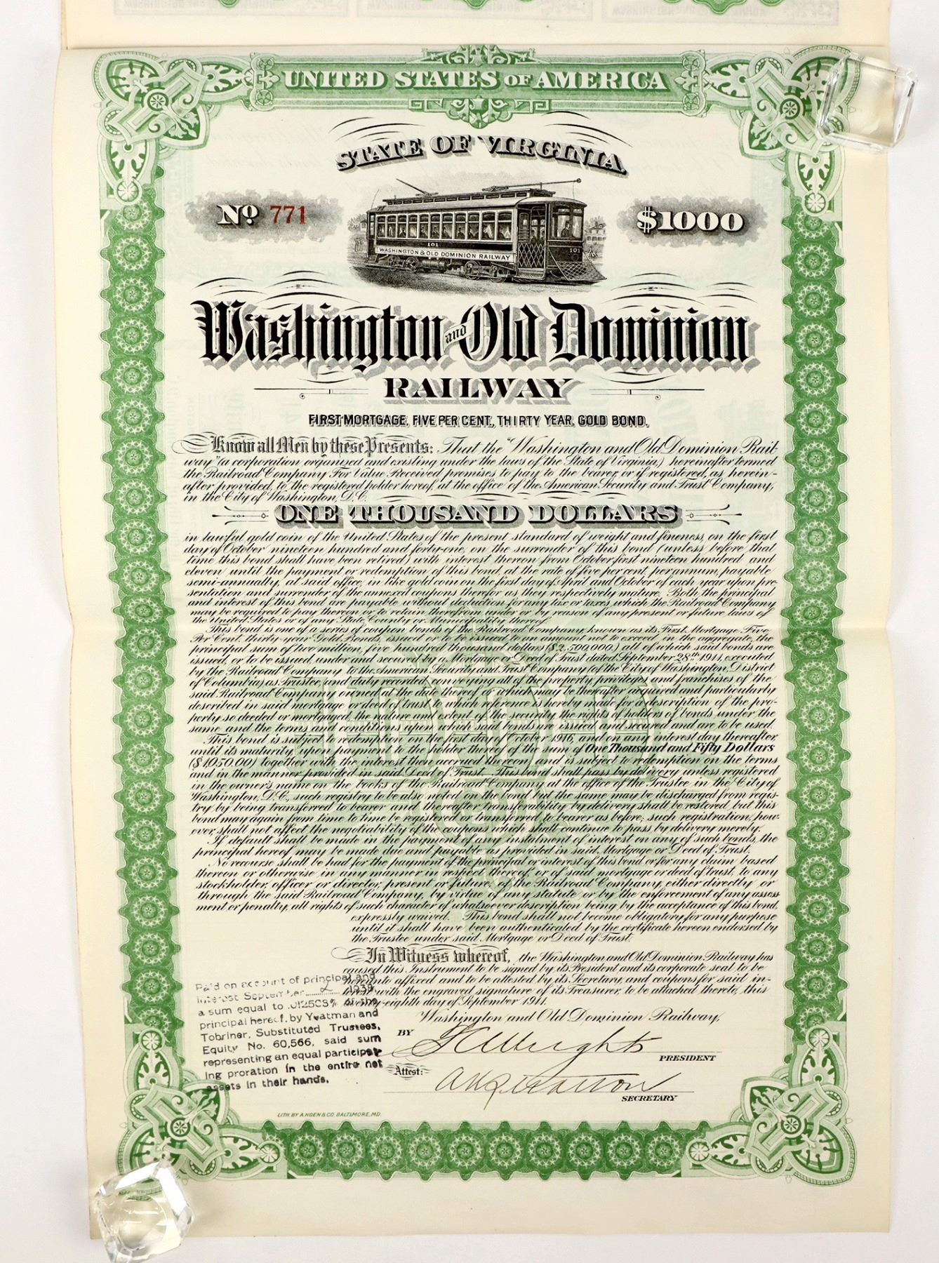 I/U. Issued 1911. EF cond. Washington And Old Dominion Railway, $1000, 5% gold bearer bond with coupons. A. Hoen printer. Shouldn't be confused with Washington and Old Dominion Railroad. .