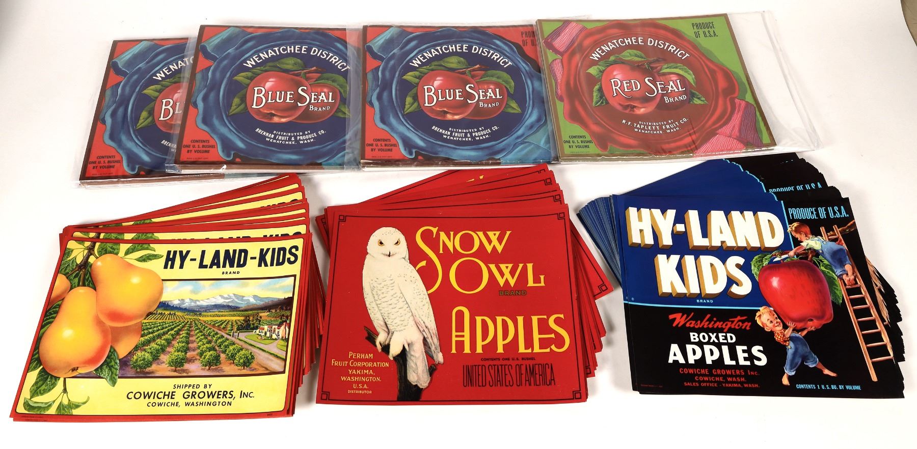 About 550 Washington apple and pear fruit crate labels. 8.5x10.5". Blue Seal, Snow Owl, Red Seal, Hy-Land-Kids Pears, Hy-Land Kids apples.