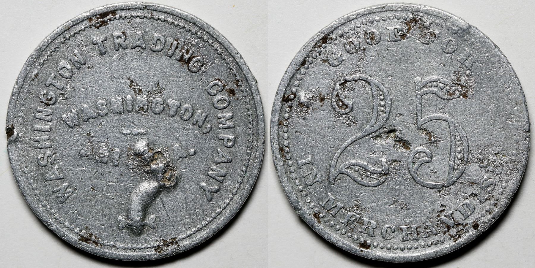 Washington Trading Company / Washington, / Astoria // GF / 25 / In Merchandise. Round, al, R-9. Size: 2-3/4cm. Ghost town; only self identified merchant for the town.