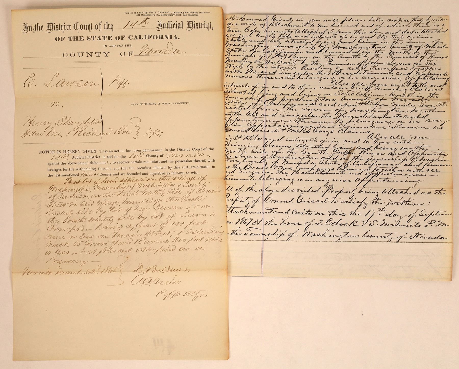 Two court documents from Washington, California, writs of attachment to Conrad Grissel. regarding 8 lots and mining claims at Washington City, Nevada County dated 1869. Signed by J.B. Gray, Constable of Nevada Township.