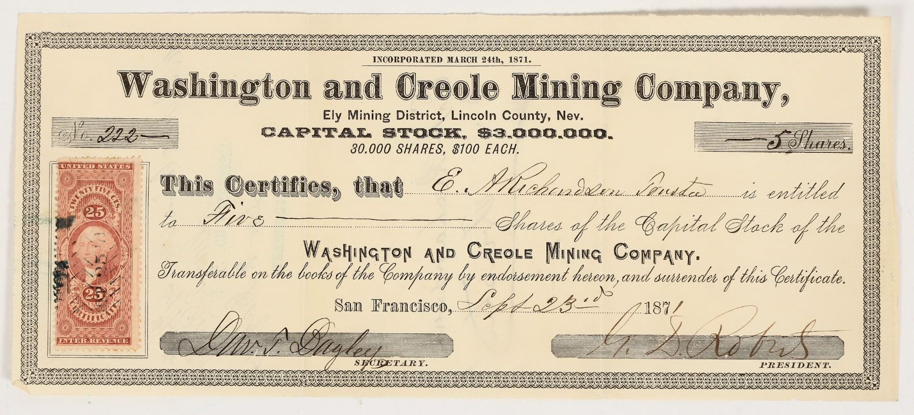 "Ely Mining District. Lincoln County, Nev." (printed under title). Inc. 1871. No. 222, issued for 5 shares to EA Richardson in Sept. 1871. Signed by president GS Robert and secretary Bagley. Not cancelled. This mine was the site of an armed takeover on Feb. 22nd, 1871, as recounted in the "Romance of Pioche," by Col. James W. Abbott (and mentioned in "An Editor of the Comstock Lode": "The first trouble occurred at the Washington & Creole. Tom and Frank Newland had made a location above the Washington & Creole mine, which latter was owned by Raymond & Ely. The Newland boys asked for the privilege of starting a tunnel below the Washington & Creole to run through the same which at this time was not considered of much value. Raymond & Ely gladly granted the privilege for the Newland boys were new-commers and needed encouragement. The boys ran in their tunnel about 30 feet underground, or from the face, and struck the Washington & Creole ledge as was expected. But, contrary to expectations, the ledge at this point was very rich, averaging about $300 per ton. It proved to be 9 feet thick. Before much was known about the strike, the Newland boys went to Ely and Raymond, and secured the privilege of taking out ore on the Washington & Creole for 30 days. They then opened up a wonderful bonanza. Everything was satisfactory. Raymond & Ely were pleased that the boys were doing well, and Mr. Raymond said that it would encourage others to dig. When the 30 days expired the ground was turned over to Withe Walker, who was foreman for Raymond & Ely. Walker went with the Newlands through the tunnel and saw thousands of tons of rich ore exposed and ready to be taken out. Walker was naturally much pleased, and said he: 'I can keep that rattletrap of a mill at Bullionville going now.' As the Burke mine was then in a pinch and not supplying the ore as rapidly as needed, everyone was pleased. Mr. Raymond said 'That ore might have lain there for years, or might never have been found.' He believed in being liberal. It was the best way, and he took considerable credit to himself for his fair dealings. He was indeed a fair man, but he had much to learn and never learned it. Well, as I have said, the Newland boys turned the thing over, and everyone thought that it was all right. The Newlands went on with their tunnel. But a mountain of ore worth $300 a ton will worry anyone when it is in plain sight and everyone is allowed to see it. Before long the Newlands got some of the new men from White Pine to help jump the mine. They built a fort in the night and manned it with men and guns for defense. Then they commenced to take out and ship the ore to Silver Peak, where there was a ten-stamp mill. There was no law in the country, and no one to stop them. It is true that a township had been formed and a justice court provided. The County had held an election and chosen John Kane, a miner, Sheriff. He went up to the fort but was ordered away. The boys continued to move the ore. Something had to be done. Raymond and Ely could do nothing, for they were told in plain words that if either of them set foot in camp it would be certain death, and there is no doubt but such would have been the case. Many men were coming from many places, some men of means. There went to Bullionville four young men, polite, gentlemanly fellows, all under 30 years of age, They were Michael Casey, Barney Flood, Morgan Courtney and Wm. Bethers. They said to Raymond and Ely: 'We will drive these fellows off it you will give us a written promise that we can have the ground for 30 days.' The bargain was made and operations begun. I was posted on everything that was going on, but did not know when or how these young men would get possession. That they kept to themselves. This is what was done; I was in a good position to see the whole battle, which was afterwards known as the Washington & Creole fight. These young men got some whiskey up to the guard in the fort. At that time there was a pretty good growth of nut pine on the hill above the fort. Here the young men hid. About 3 o'clock there came a shout, and the four young men ran rapidly down the hill, each with a pistol in hand. They drove the others out and away from their arms. I heard the shots and saw one man fall, Snell by name, and I saw Casey take a rifle and knock a man down the bank with it. Many shots were fired and many men were wounded, but Snell was the only one killed in that fight. Nevertheless, I have heard others tell of the same fight and give the number of killed as 10 or 12. But I was an eye witness and very much interested, and I am sure that one man only was killed. I do not remember the number of wounded. The boys who did that piece of work made $15,000 each of their lease of 30 days. Raymond and Ely bought the ore and paid them their money for it."