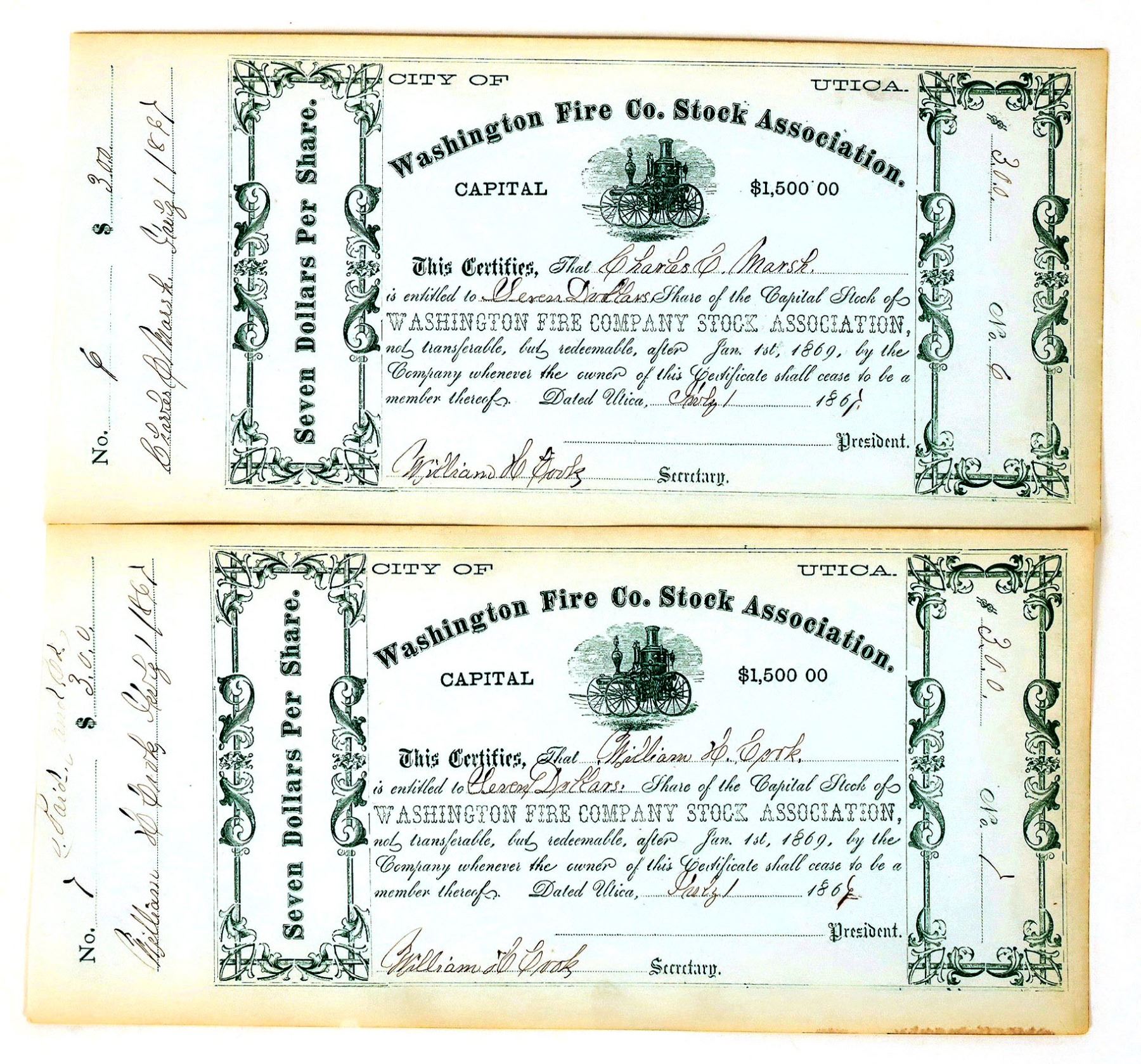 2x 1867 Washington Fire Co. Stock Association stocks with green steam pumper vignette. Appear to be issued, but lack president signature. Some edge toning, otherwise fine condition without creases.