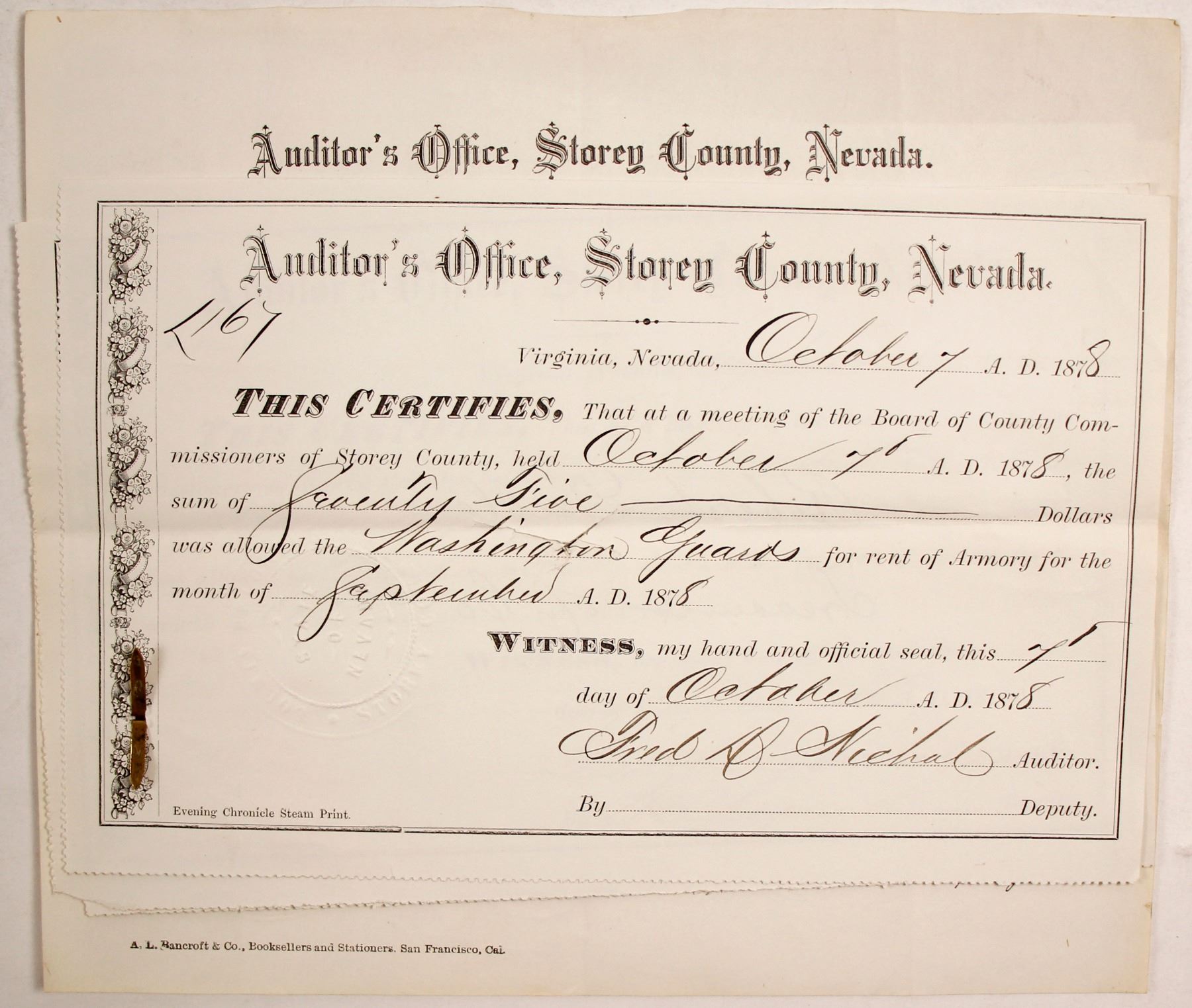 Four Storey County Auditor's Office documents attached together that are receipts from July, August, September, and October 1878 for the funds allowed for the Washington Guard to rent the armory for a month. Signed by the auditor (and some signed by the deputy. Reverses signed by representatives for the Washington Guard. The 1881 Appendix to Journals of Senate and Assembly lists the Washington Guard as Company E of the Nevada Infantry. It is also listed as one of the five military companies in Virginia City by De Quille in the History of the Big Bonanza.