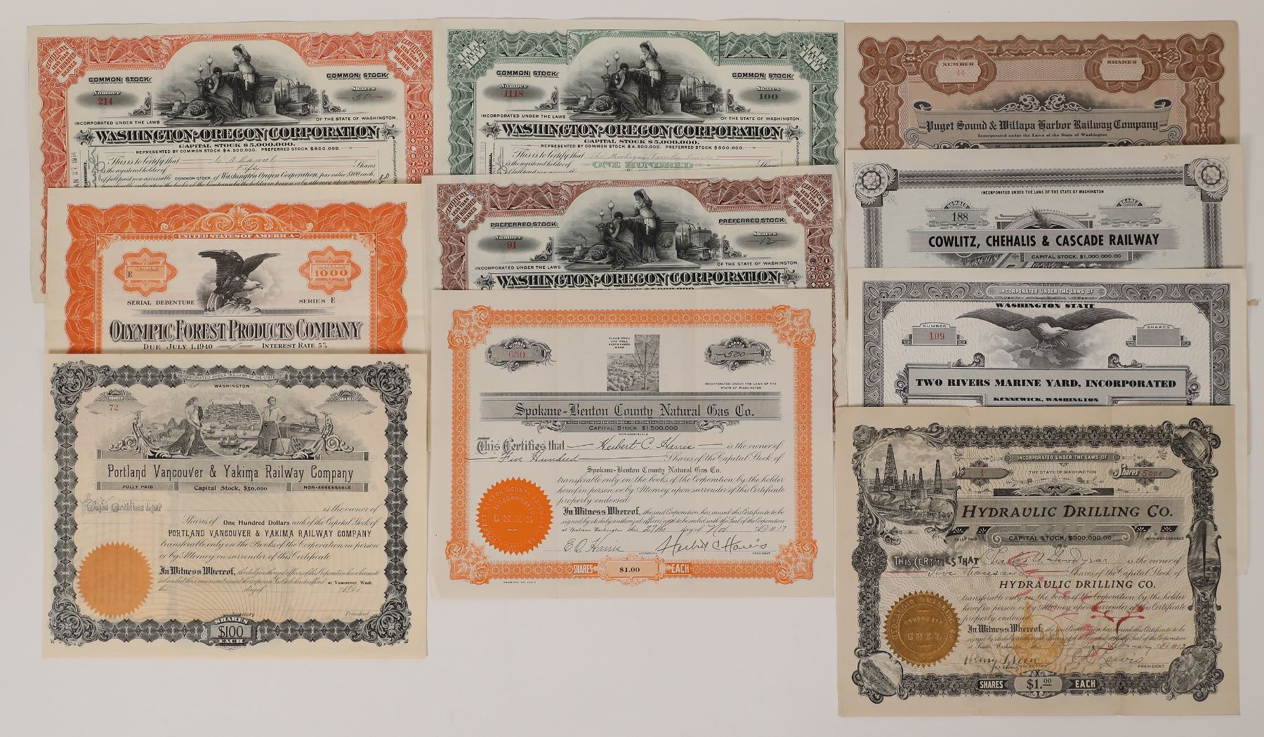 Washington non mining stocks and 1 bond. Stocks-Washington Oregon Corp.-3 different, Puget Sound & Willapa Harbor Railway, Cowlitz Chehalis & Cascade Railway, Portland Vancouver & Yakima Railway, Spokane Benton County Natural Gas, Hydraulic Drilling, Two Rivers Marine Yard. Bond-Olympic Forest Products. Washington