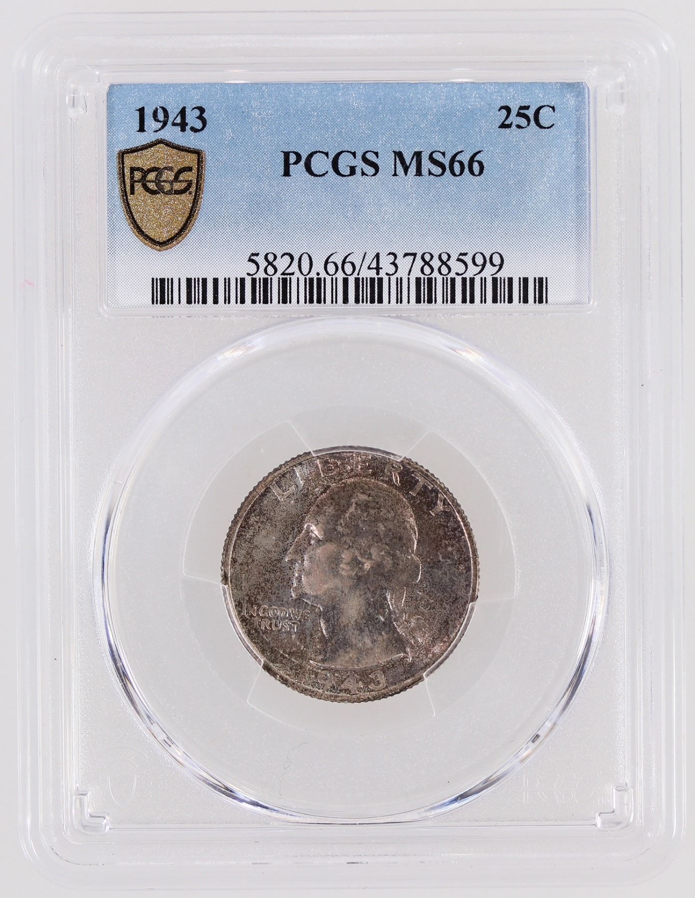 PCGS certified MS 66: 1943 Washington quarter, toned.