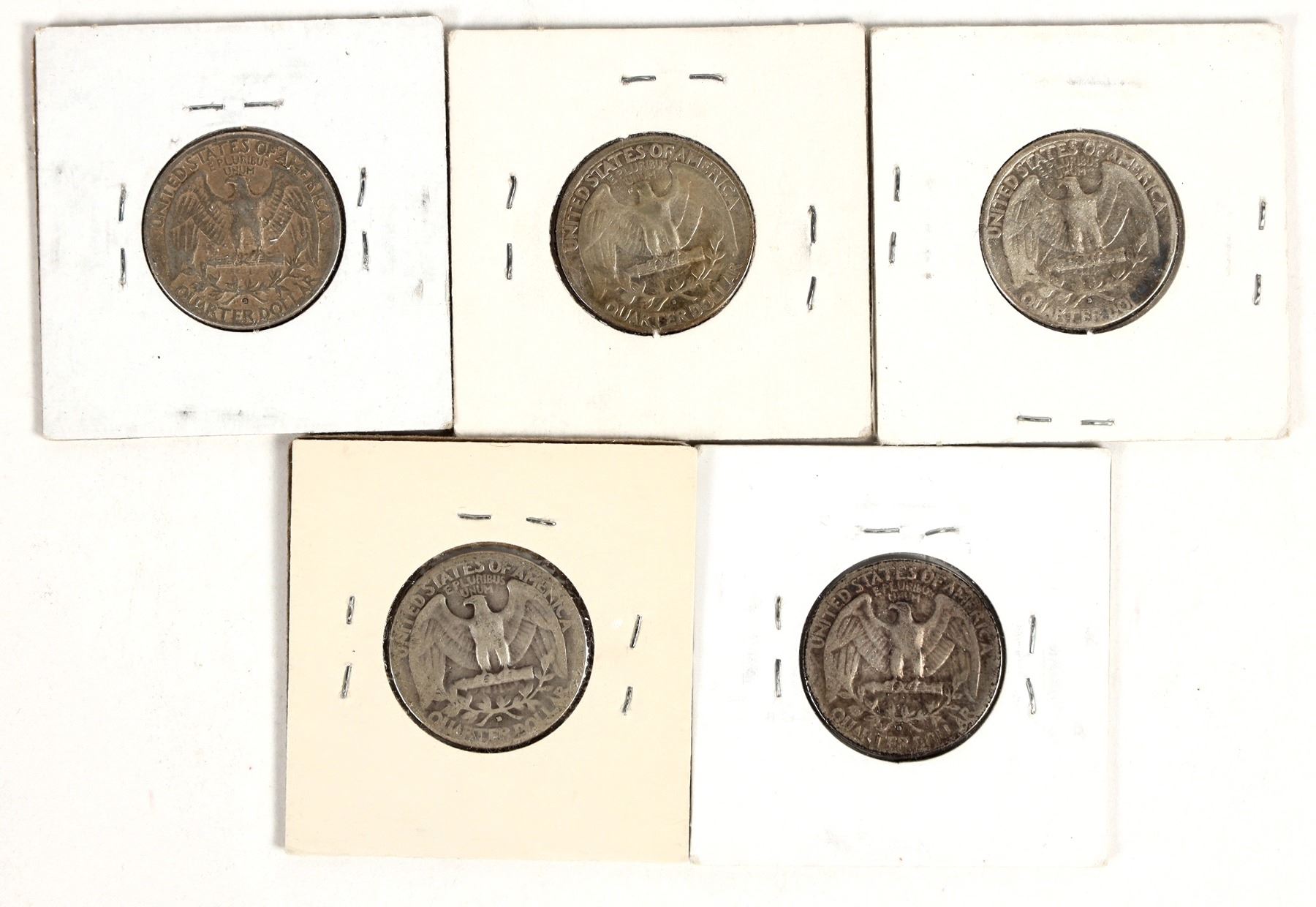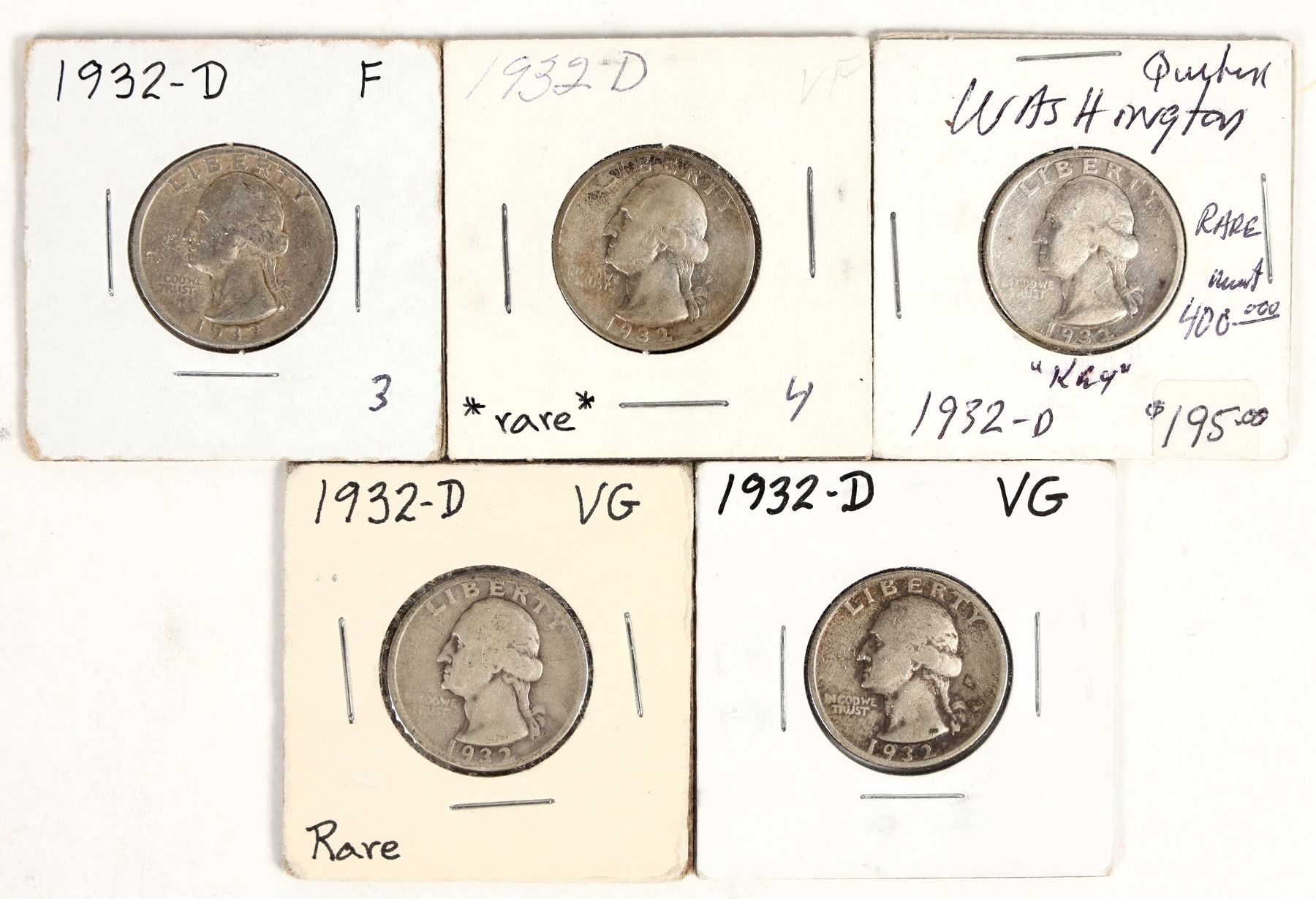 Five examples of the key date 1932-D Washington quarter. G, 2 VG, VF, F.