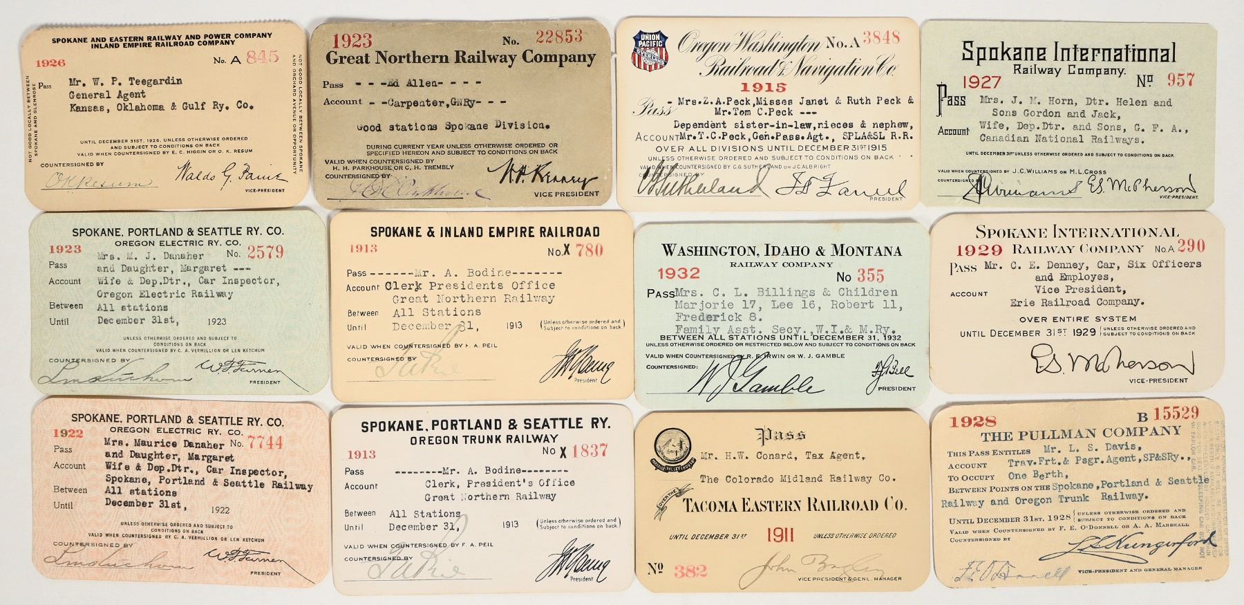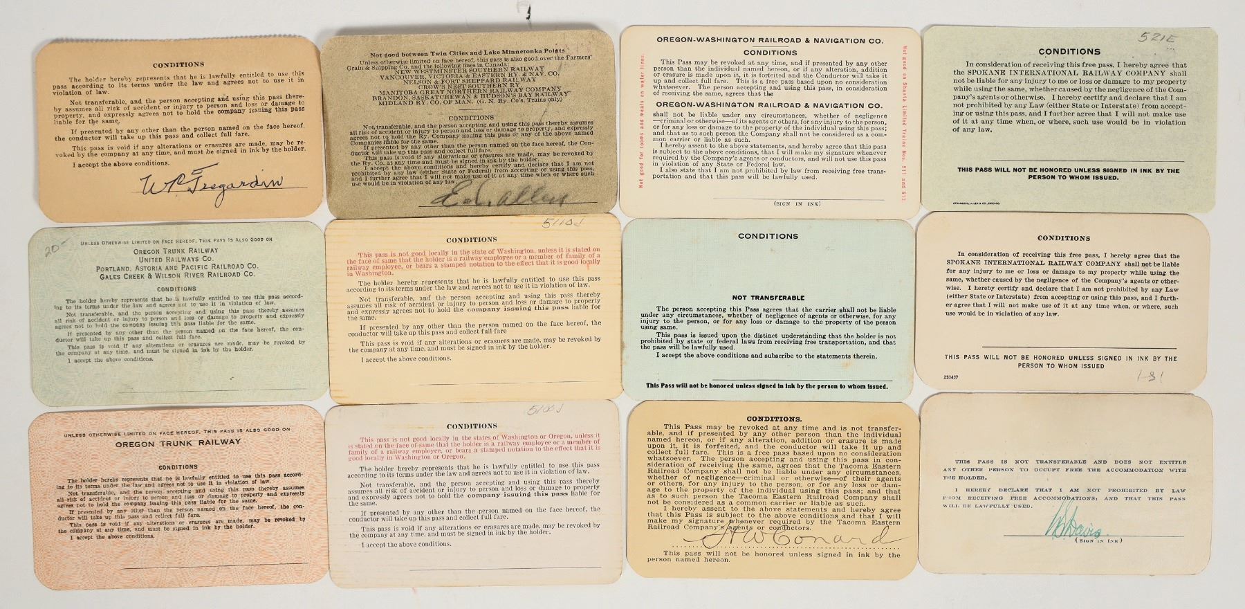 Lot of 12. In very good condition. I.E; No A3848 Oregon Washington RR & Navigation Co. w/color Union Pacific shield, 1915. No. 382 Tacoma Easter RR Co. 1911 w/vignette upper left Paradise Valley Route. Spokane, Portland & Seattle RY (3). Great Northern Railway Co. The Pullman Co and more.