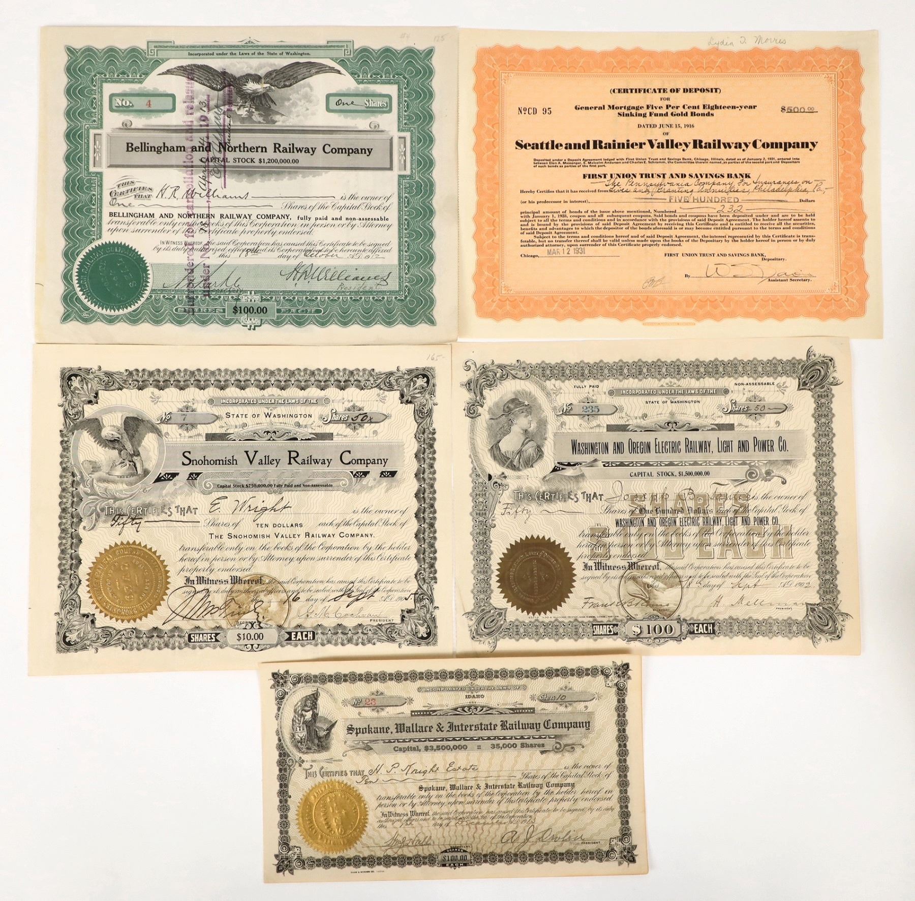 Group of 5 stock certificates from various Washington State-based railroad companies, issued 1902 to 1931. All issued, one cancelled. Lot includes certs from the Spokane, Wallace & Interstate Railway; Washington and Oregon Electric Railway, Light and Power Co.; Seattle and Rainier Valley Railway; Bellingham and Northern Railway; and Snohomish Valley Railway. Whole lot in generally good condition, see photos.