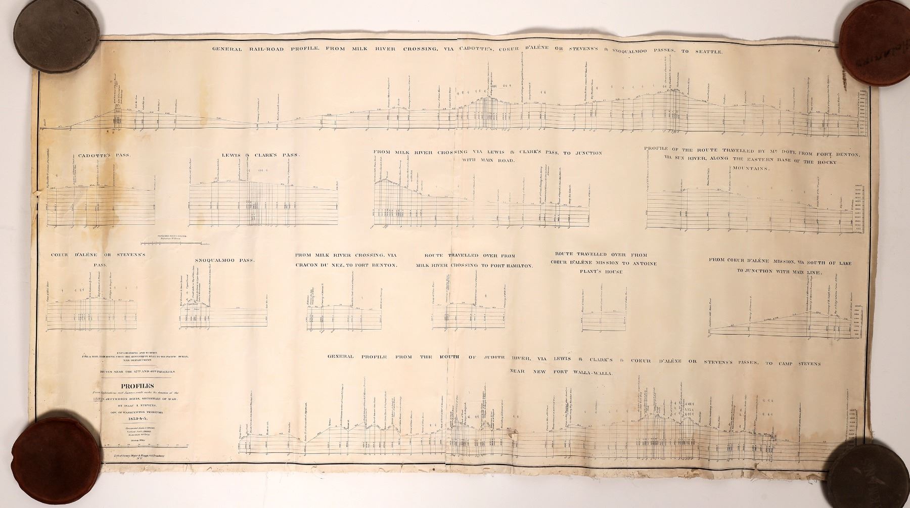 1853-55 general railroad profile from Milk River Crossing via Cadotte's, Coeur D'Alene or Stevens or Snoqualmoo Passes to Seattle. Elevations display in graph style. Interesting note on lower left, Hon. Jefferson Davis, Secretary of War as printed has been altered to Dishon with Dis added in pencil. Davis later was President of the Confederacy. 22x42". Stains and edge tattering. Washington