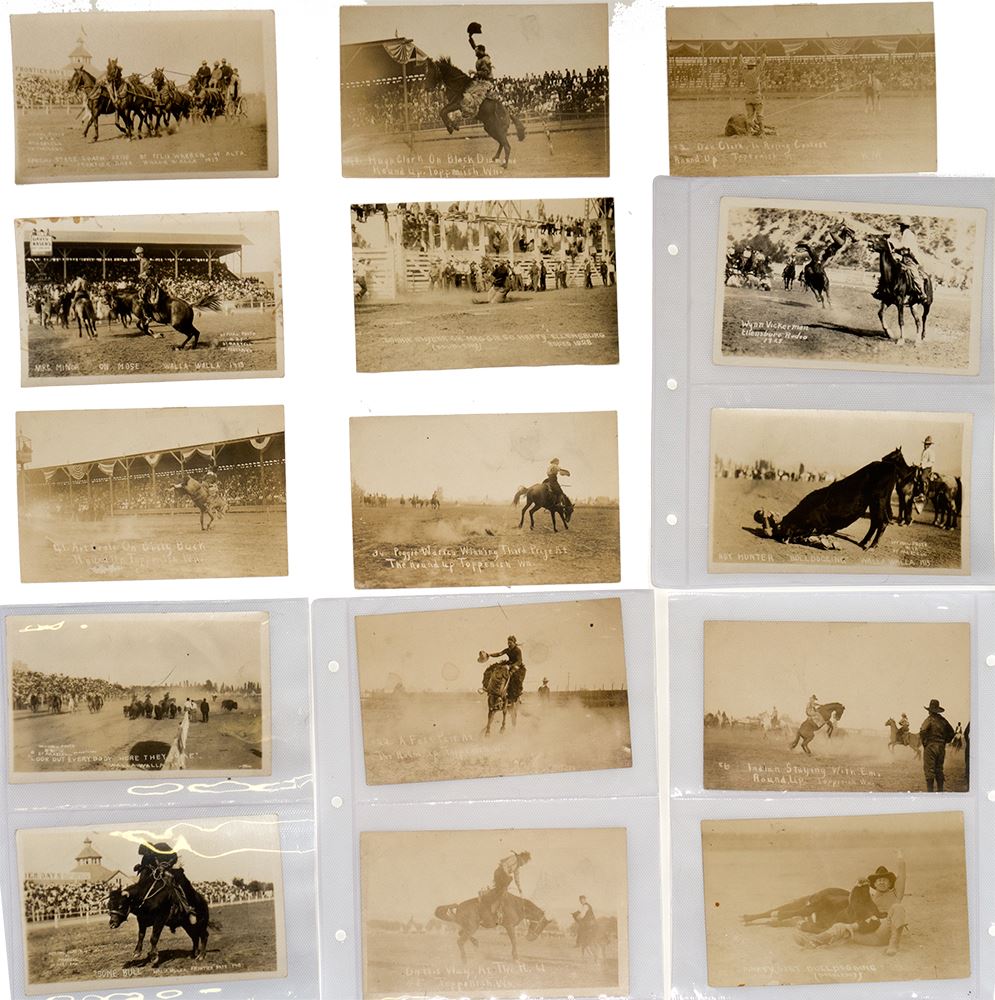 Lot of 15. Walla Walla, Ellensburg, and Toppenish. None were postally used. No duplicates. Riders such as Roy Hunter, Wynn Vickerman, Donnie Snyder, Dan Clark, Pinkey Gist, and Hugh Clark. A few have the photographer identified as Marcell in Portland (active 1911-1925). General condition is good.
