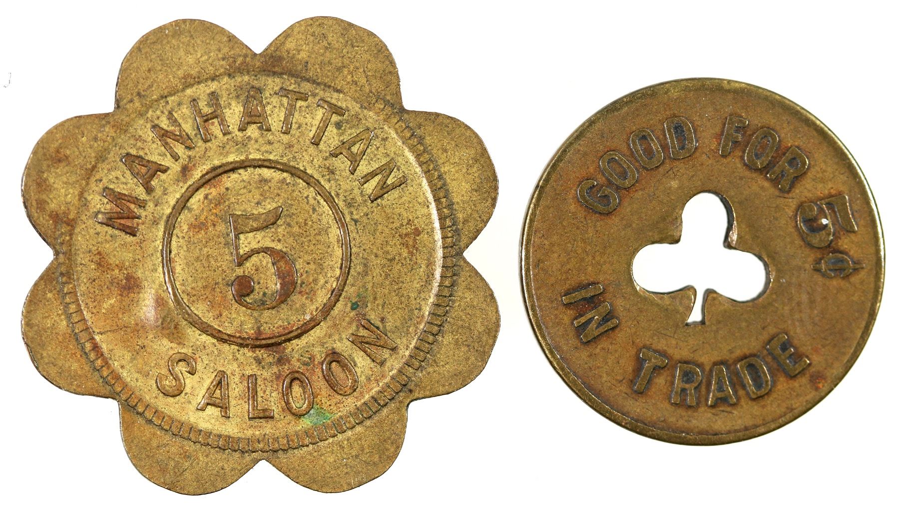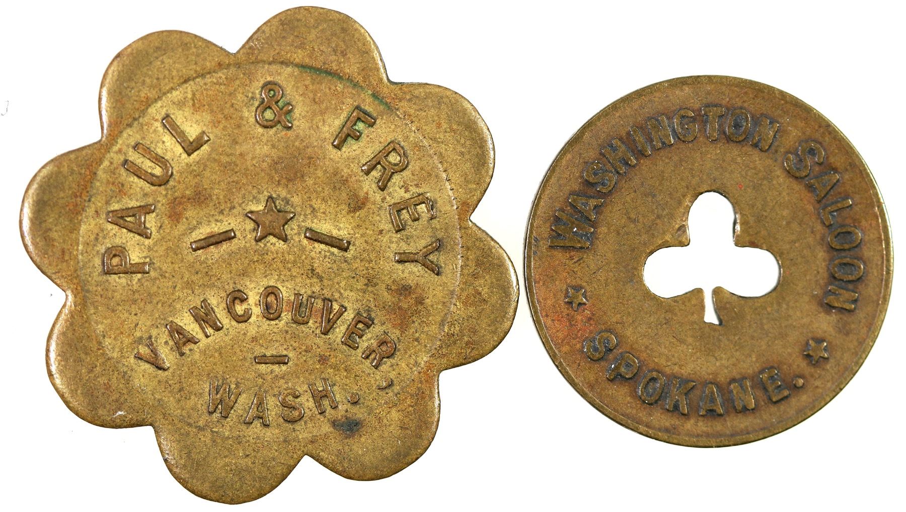 Two saloon tokens from Washington state: 1) WASHINGTON SALOON / SPOKANE. // GOOD FOR 5¢ / IN TRADE (clover/club cutout); Br. rd., 21 mm, R 7. 2) PAUL & FREY / VANCOUVER, / WASH. // MANHATTAN / 5 / SALOON; Br., Sc 8, 28 mm, R 6.[ Washington