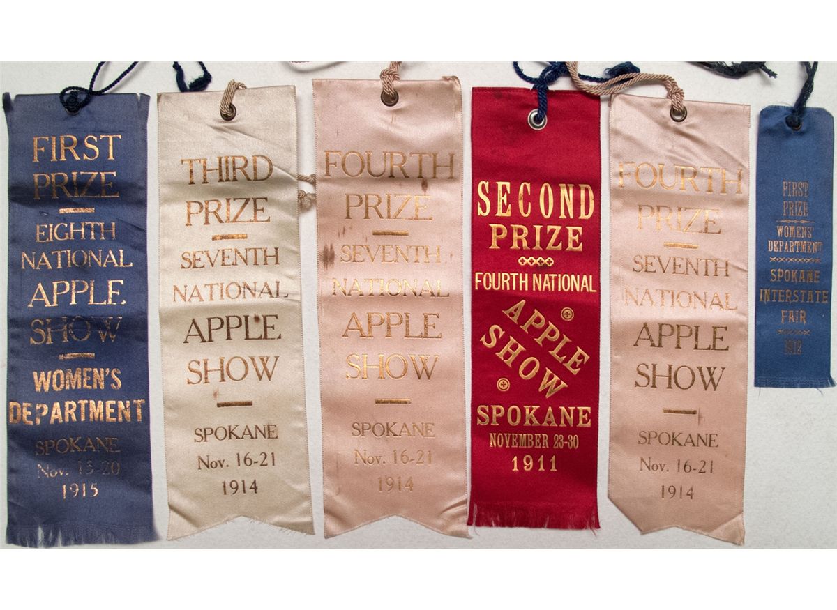 1) First prize at eighth national apple show, 1915. 2) Second prize at fourth national apple show, 1911. 3&4) Fourth prize at seventh national apple show, 1914 (two). 5) Third prize at seventh national apple show, 1914. 6) First prize / women's department / Spokane Interstate Fair / 1912. Date: Spokane WA hwac 2262
