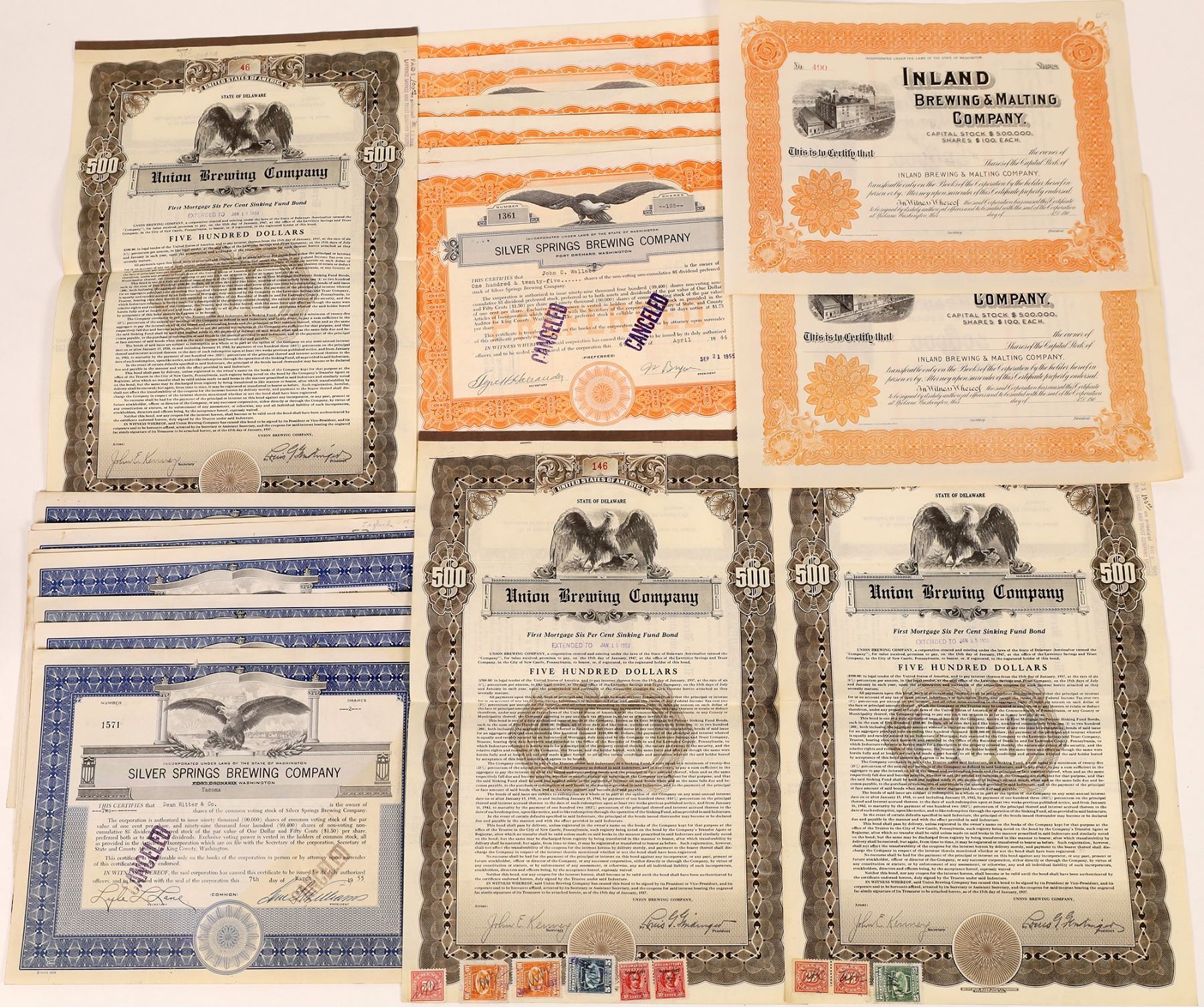 Lot of 26, three different companies. Includes: Silver Springs Brewing Company (21 stocks, Port Orchard, 1943-1959); Union Brewing Company (3 $500 bonds, 1937); and Inland Brewing & Malting Company (2 unissued, pictorial, 190_). Please inspect.