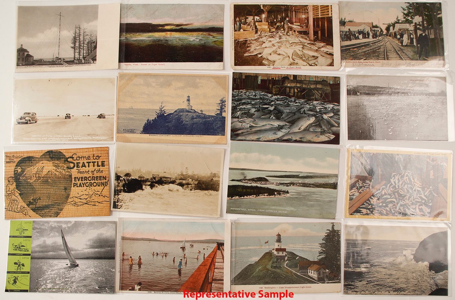 Lot of 24 including one wooden postcard and 7 real photo. Wooden postcard is advertising Seattle and Mt. Rainer, c.1936, made of Native Washington Spruce. RPCs include: map of Long Beach peninsula; lighthouse North Head Light; aerial of Tatoosh Island; waves crashing at Pacific Beach; Long Beach Blvd.; cars on beach; and Nahcotta oyster company. Sixteen other printed cards: US Gov't Wireless Telegraph Station at North Head; Puget Sound scenes; seagulls; sailboats; fish harvests; Rubberneck Row at Long Beach; Cape Disappointment Lighthouse; Fort Canby Lighthouse; and Lighthouse and fog horn station at Westport. Eleven mailed, 1907-1936. (Prag Collection) Date: Location: Washington HWAC# 55502