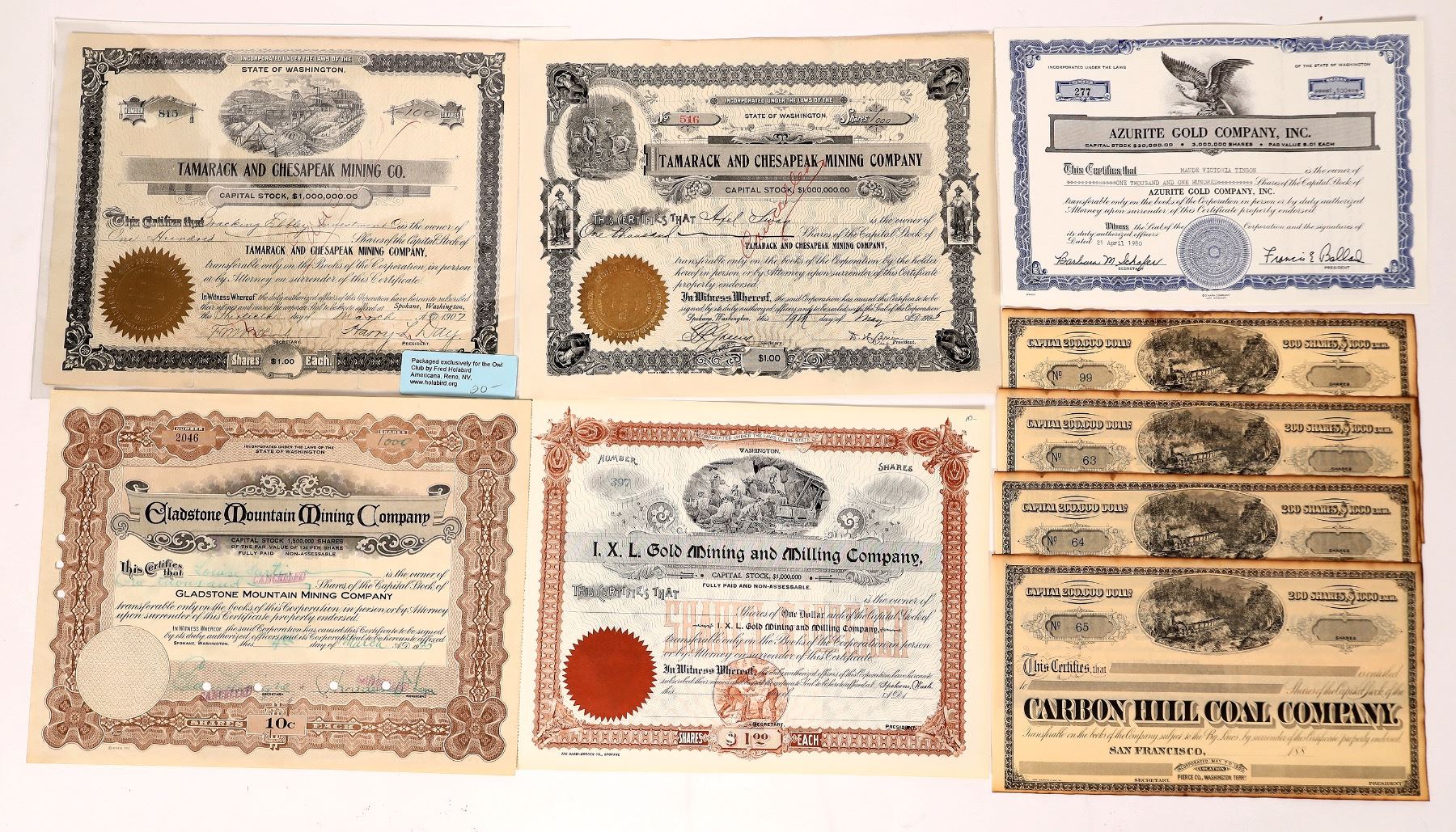 Lot of 9. Includes: Carbon Hill Coal Company (4 unissued stocks, Pierce County, 1880s); IXL Gold M&MC (unissued, Spokane); Azurite Gold Co., Inc. (1980); Gladstone Mountain MC (1925); and Tamarack & Chesapeak(sic.) Mining Company (2 stocks, 1905-07, mining vignettes, Spokane). Please inspect.